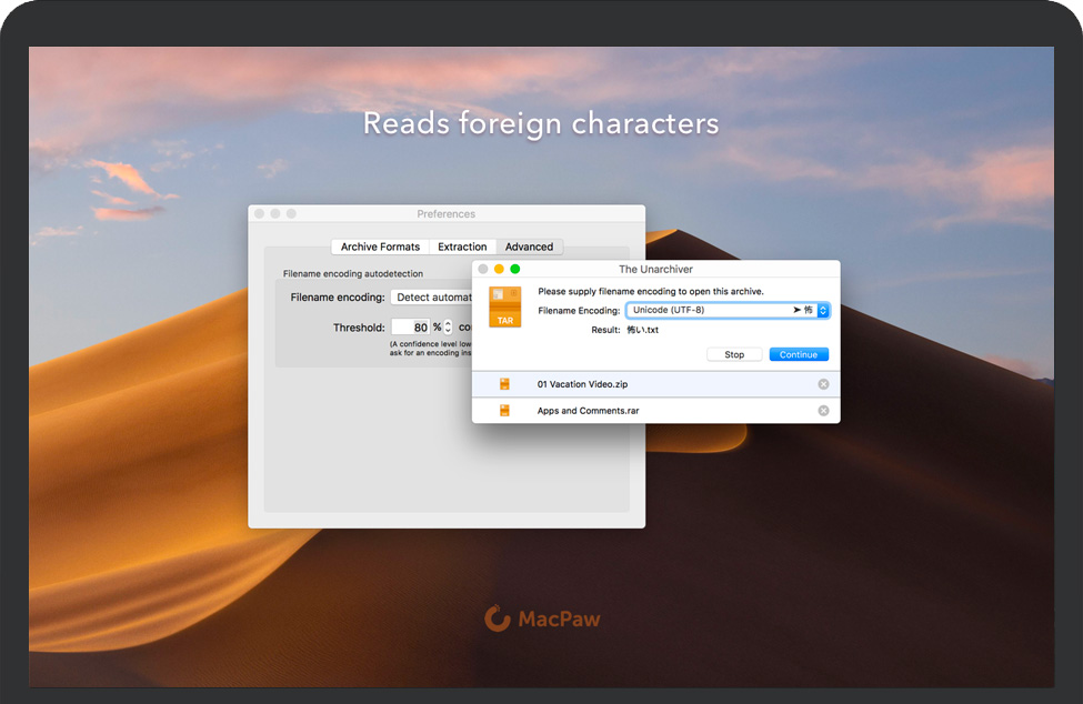 The Unarchiver for Mac 是一个小巧且易于使用的程序,可以取消归档许多不同类型的归档文件。The Unarchiver将开放Zip、RAR(包括v5)、7-Zip、Tar、Gzip和Bzip2等常见格式。它还将打开许多旧格式,如StuffIt、DiskDoubler、LZH、ARJ和ARC。The Unarchiver甚至可以打开其他类型的文件,比如ISO和BIN光盘图像,以及一些Windows系统的EXE安装程序。