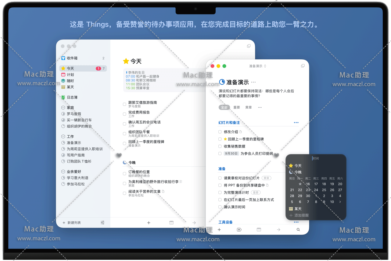 Things 专为 Mac 量身订制并有深度系统集成。从其他应用快速建立待办事项、连接日历、启用今天小工具、从提醒事项导入 —Things 无所不能!若您需要强大的自动化功能,甚至还有 AppleScript 支持。