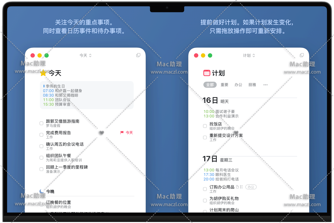 您的日程安排的所有内容都整齐地排列在“今天”和“计划”列表中,显示待办事项和日历事件。每天早上,查看今天计划并决定想做什么。