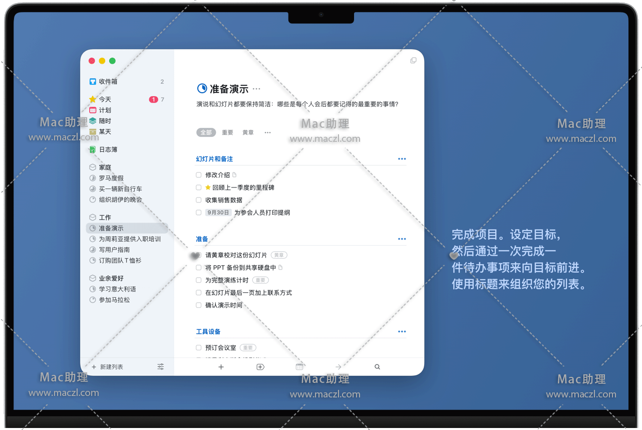 为任何重大目标建立项目,再添加待办事项以完成目标。在进行规划时,使用标题让列表更井井有条。还有一个地方可以写下备注,并且可以订定截止日期以掌控进度。