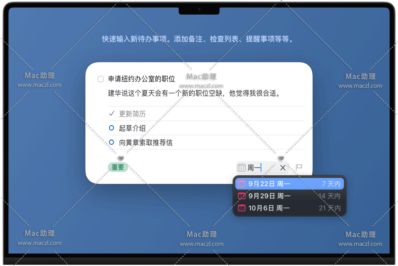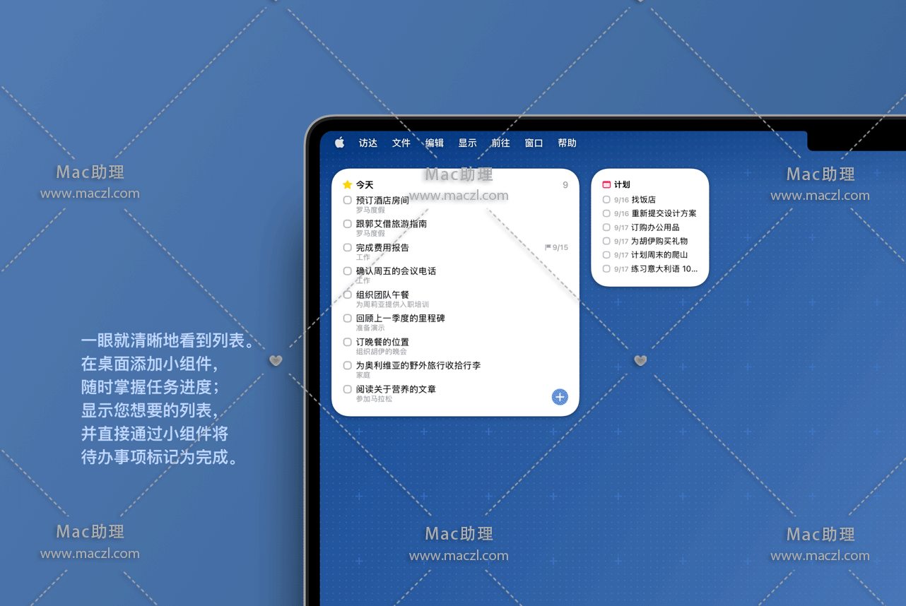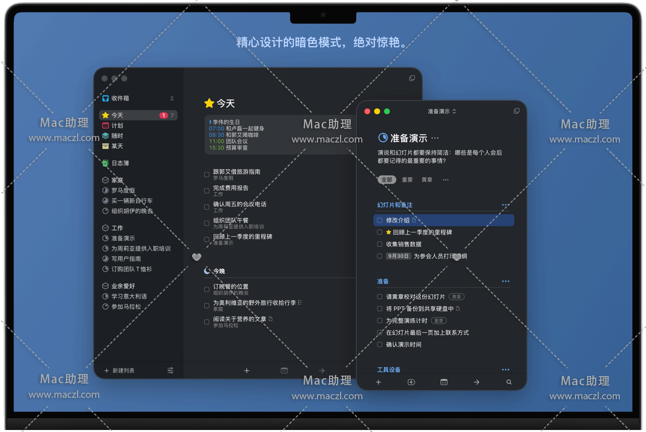 以强大的“待办事项”为基本组成部分 — 每一则待办事项都是迈向大成就的一小步。您可以为其添加备注、加上标签、安排时程,或者再将其细分成更小的步骤。