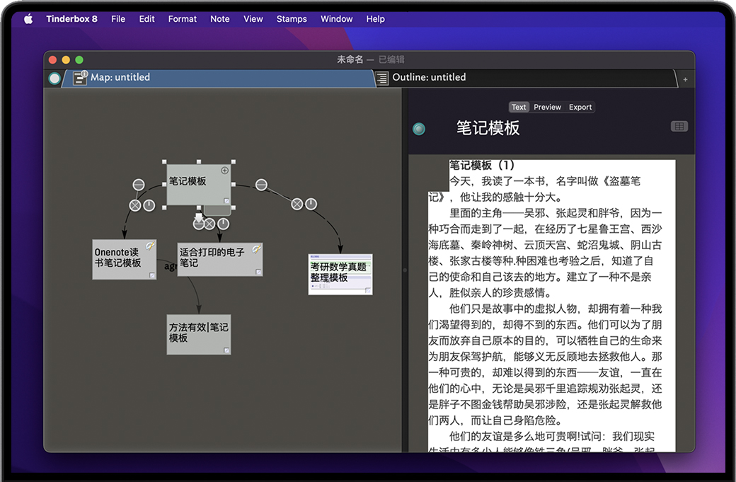 Tinderbox会在您制作笔记时绘制笔记地图。建立关系的依据安排笔记,组织形状和颜色,以及链接他们。Tinderbox让你快速记录想法把它们放在你需要的地方。