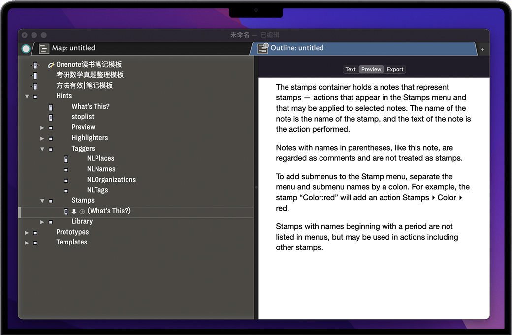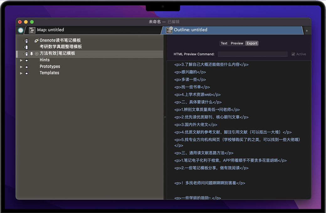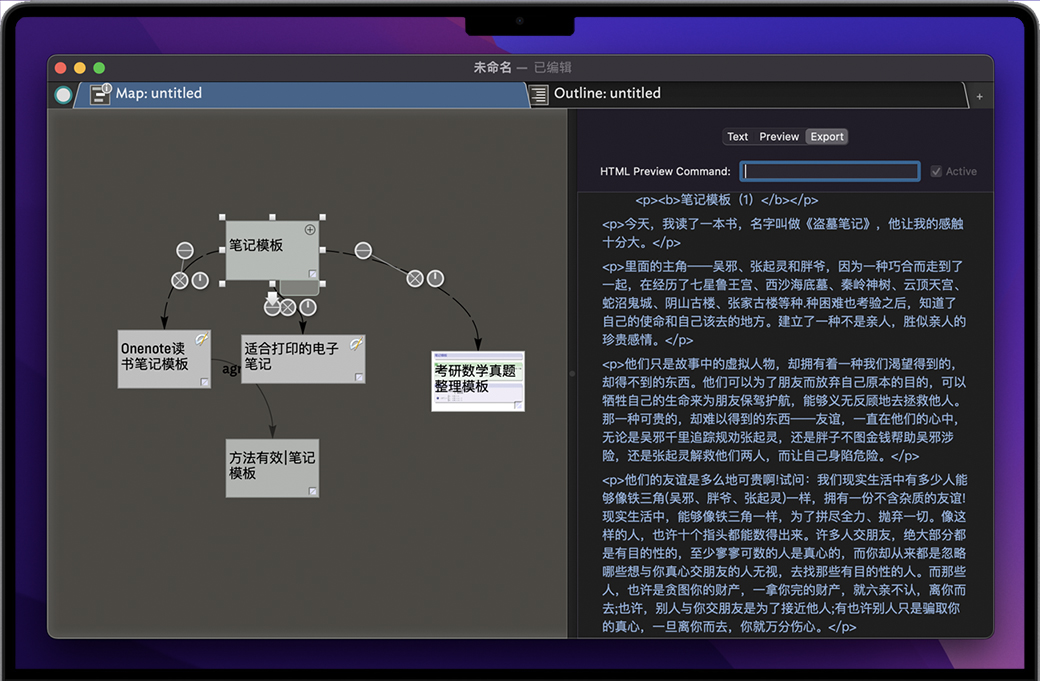 有了Tinderbox,您的数据就是您的了。Tinderbox文件是XML,Tinderbox可以创建HTML、XML、RSS、OPML等。Tinderbox与Simplenote、notes、Evernote和DEVONthink Pro Office共享笔记,用于iPhone和iPad的协调。