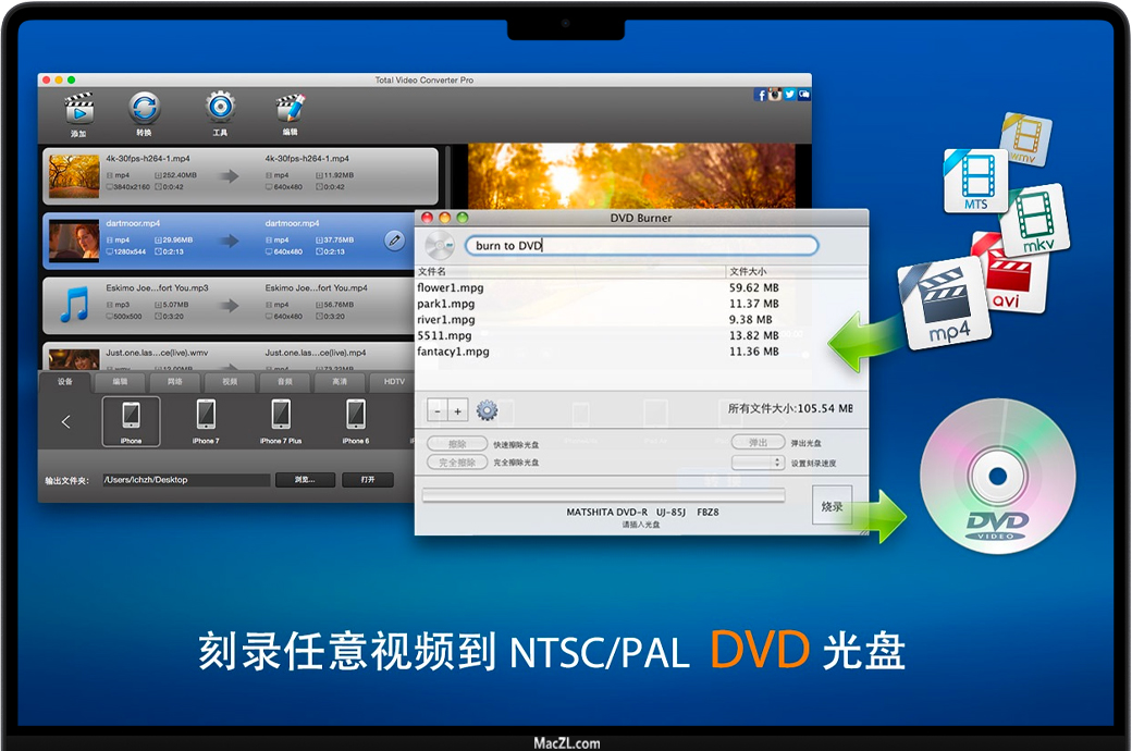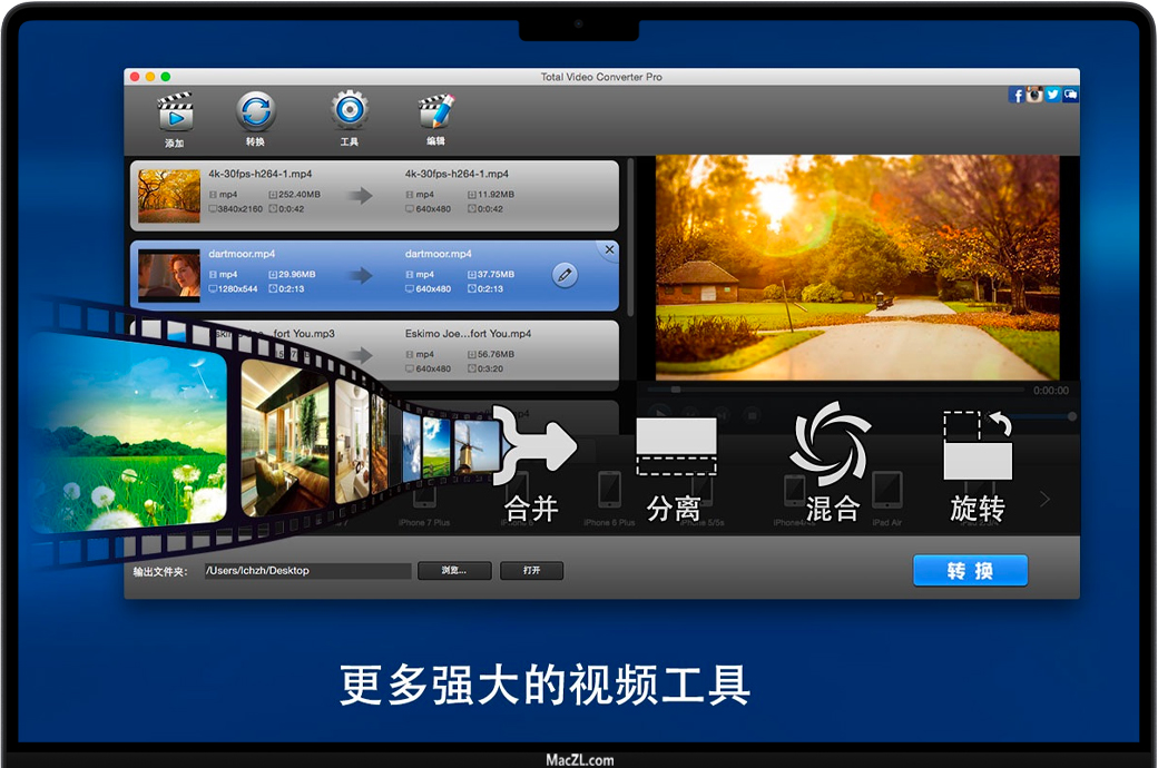 Total Video Converter Pro for Mac 中文名:超级转霸。是一款非常强大,全功能的转换器,视频编辑器和DVD刻录机,支持几乎所有的视频和音频格式。Total Video Converter Pro一款软件,兼具多款软件的功能:视频/音频转换 + 视频刻录 + 屏幕录制 + 视频/音频编辑 + 视频/音频裁剪 + DVD刻录 + DV自动输入 + 视频合并/分割 + GIF输出 + 音频提取 + 视频特效 + 视频/音频复合。