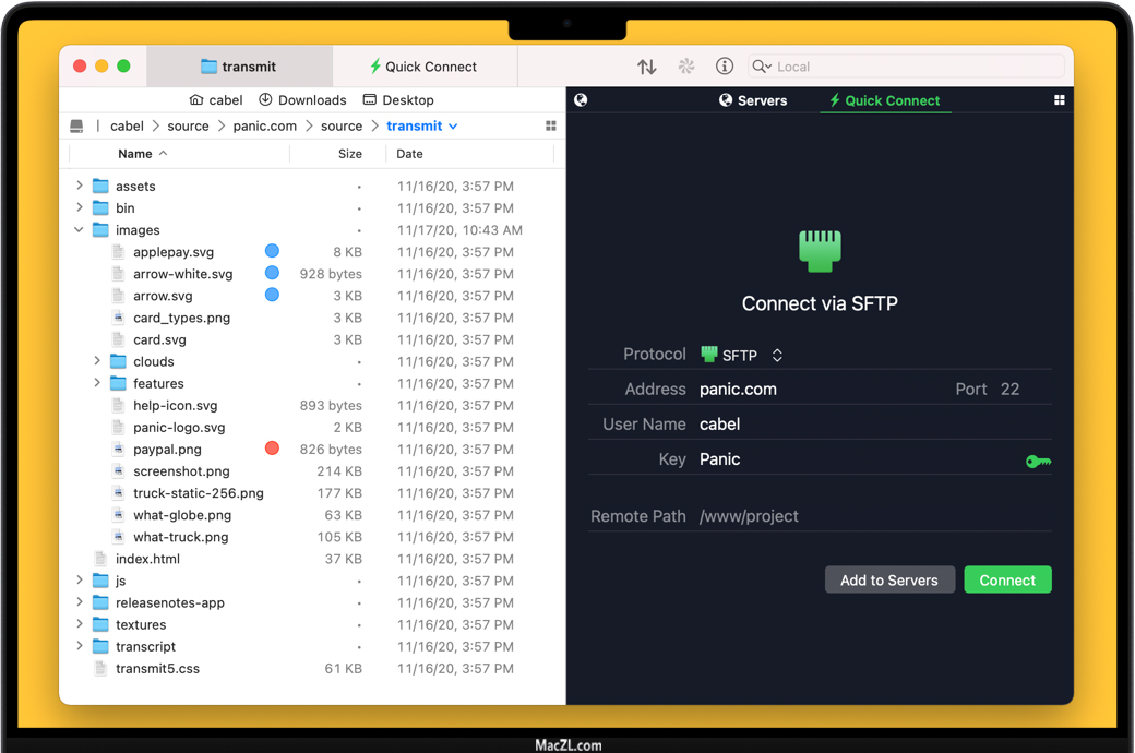 Transmit 5 for Mac引入了 Panic Sync,这是我们安全且快速的站点同步解决方案。