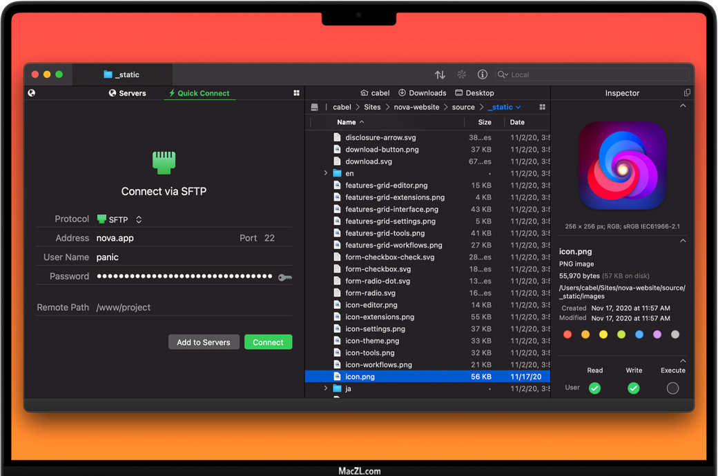 当然,Transmit 5 for Mac 仍然是处理经典协议(如 FTP、SFTP、WebDAV 和 S3)的最佳选择。我们让复杂的服务变得像拖放操作一样简单。