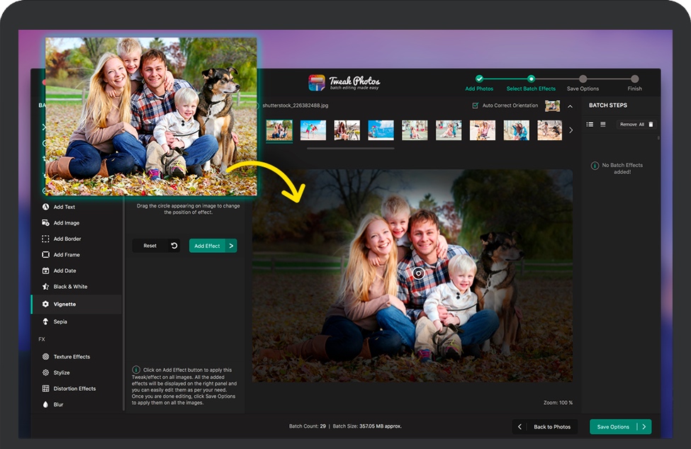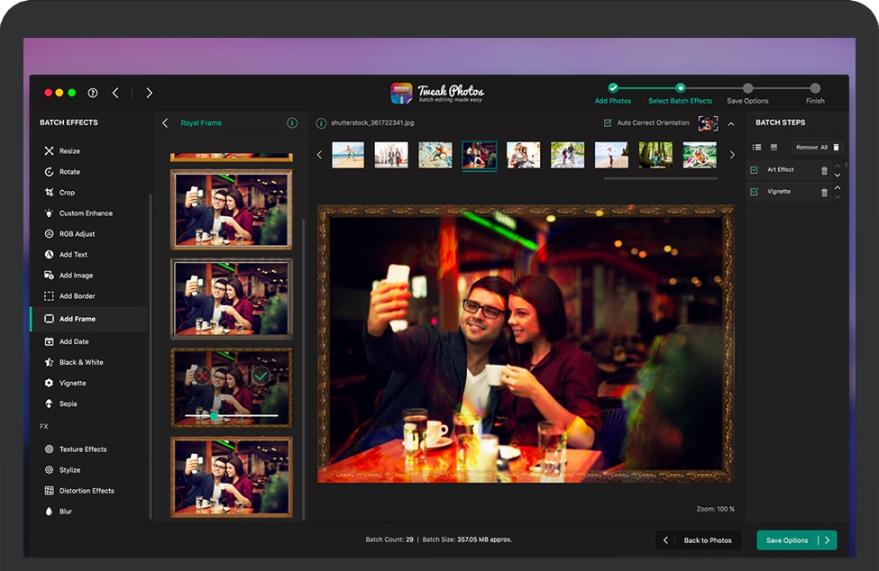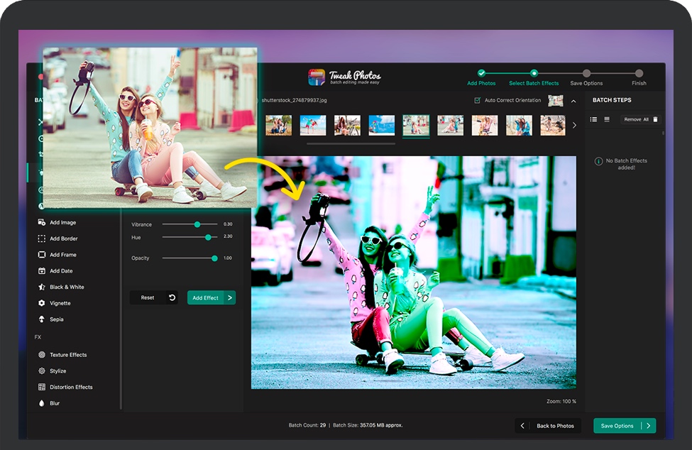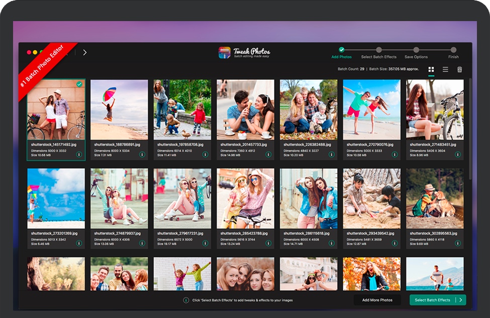 Tweak Photos for Mac允许您选择效果并将它们一起应用于整批照片。Tweak Photos不是一张一张地增强照片,这绝对是一项乏味的工作,