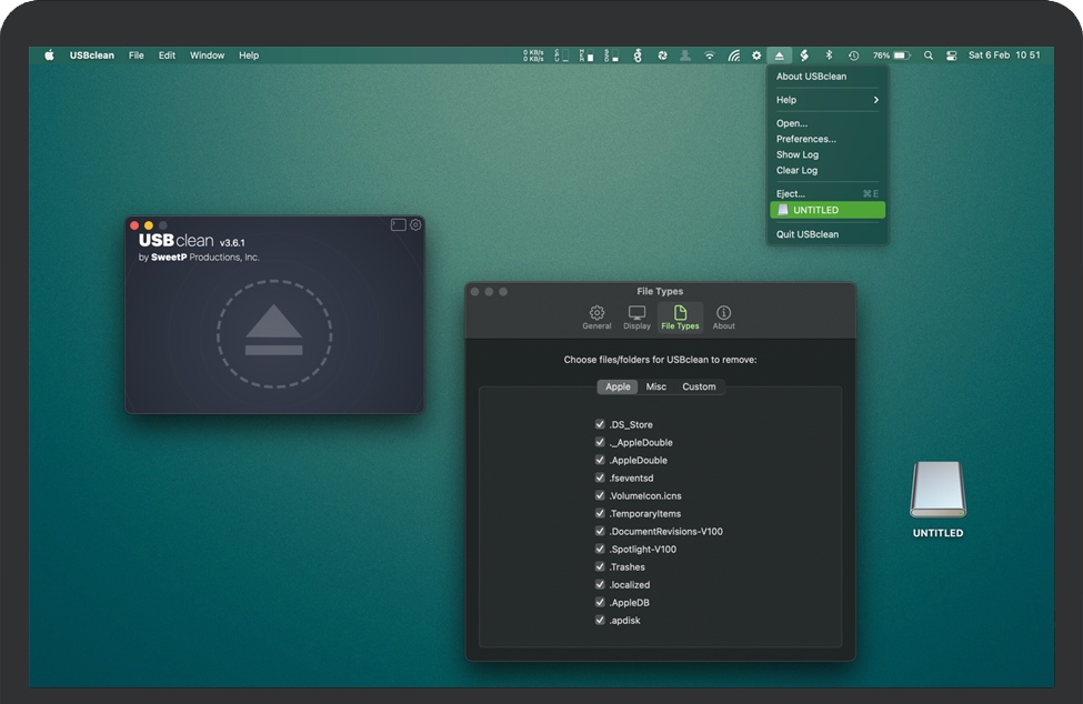 USBclean for Mac 是一款适用于 USB 垃圾文件清理工具。它可以帮助您清理 USB 存储设备中的 .DS_Store、._AppleDouble、.fseventsd、.volumeIcon.icns、.TemporarItems、.DocumentRevision-V100、.Sportlight-V100、.Trashes、.localized、.AppleDB、.apdisk 等垃圾缓存文件。