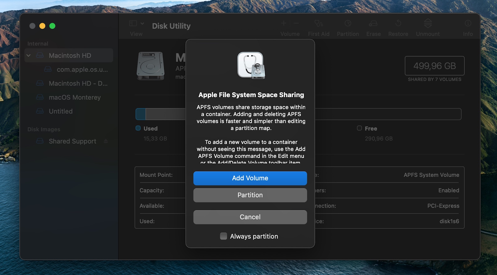 使用APFS格式,您只需向驱动器添加一个额外的卷即可