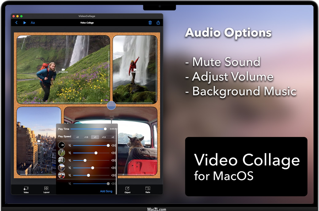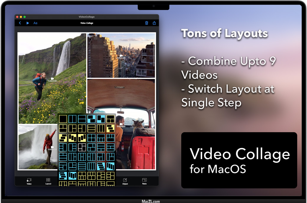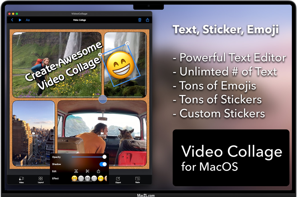 视频拼贴 for Mac: 英文称其为Video Collage,是一款组合多个视频以创建精美的视频拼贴的macOS软件。除此之外,视频拼贴还可以将多个视频合并为拼贴,支持调整拼贴比例、添加表情符号和贴纸、调整边距等,还提供了创建幻灯片、将多个小型视频放入一个背景视频中等实用的功能,功能很全面。