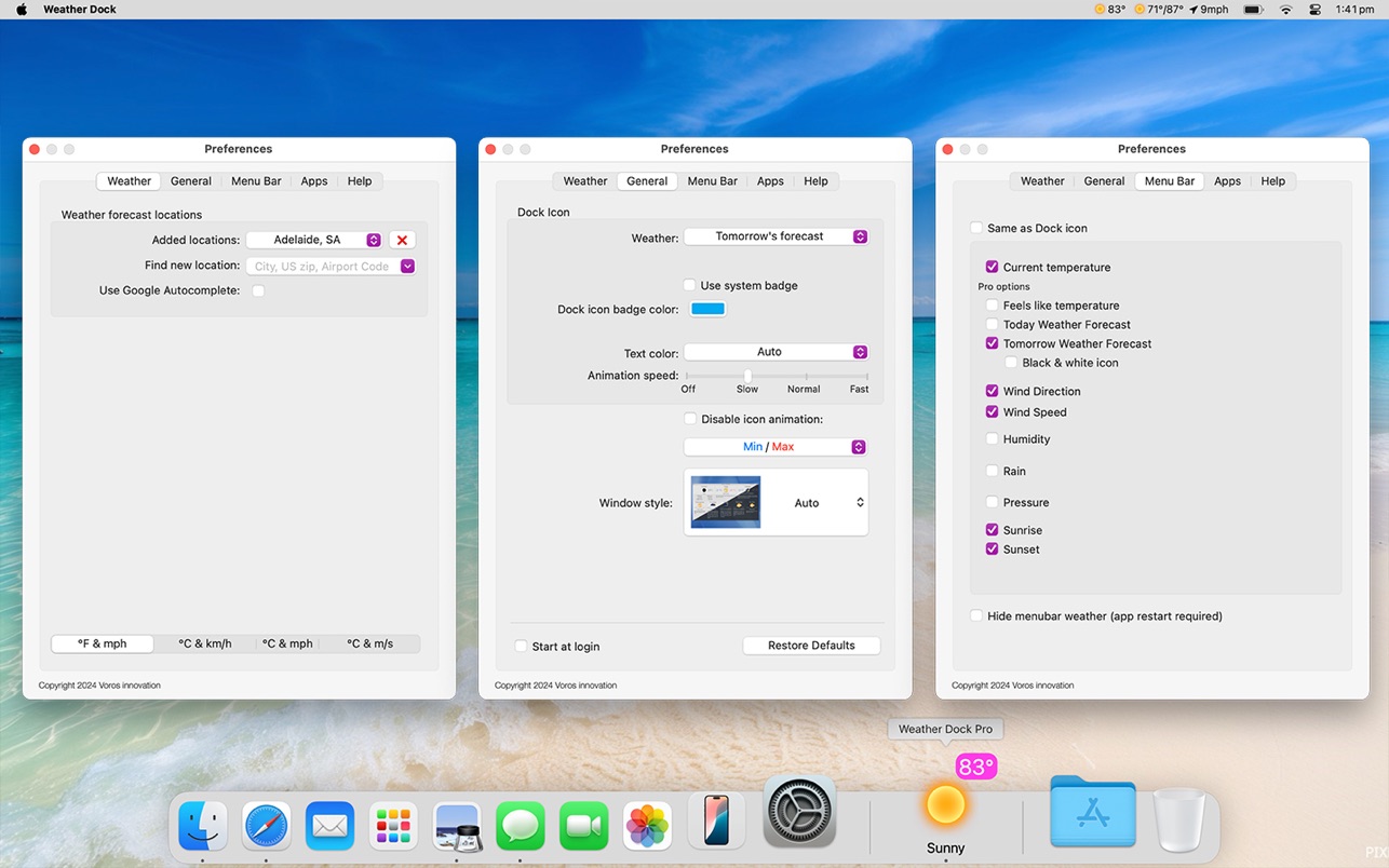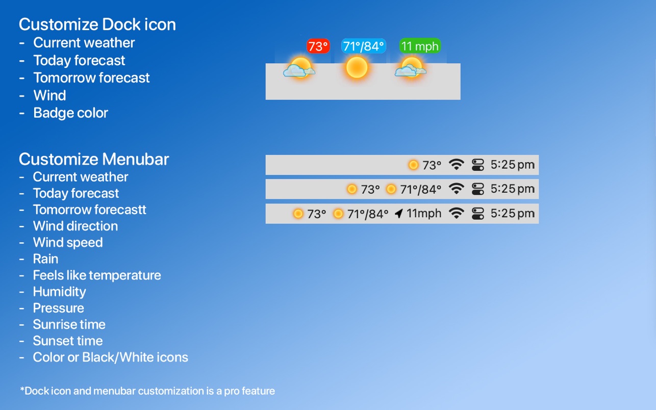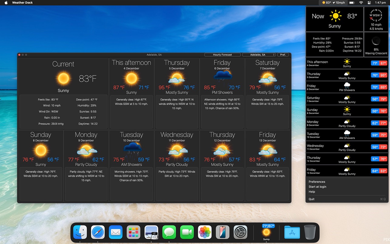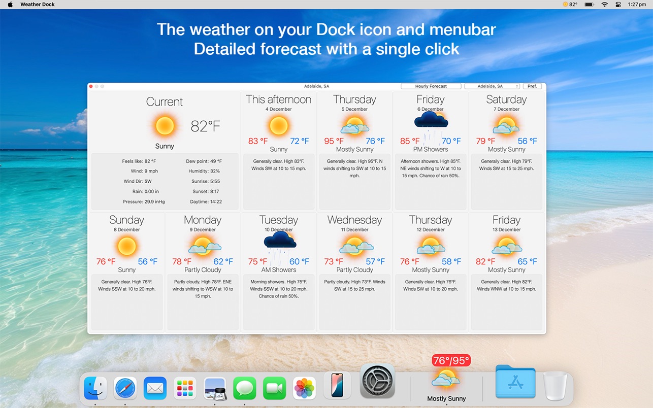 Weather Dock将天气状况呈现在您的桌面上。只需扫一眼底座图标就能了解当前的天气状况以及今日或明天的预报。单击一下就能了解详细的当前状况和7天内的天气预报。