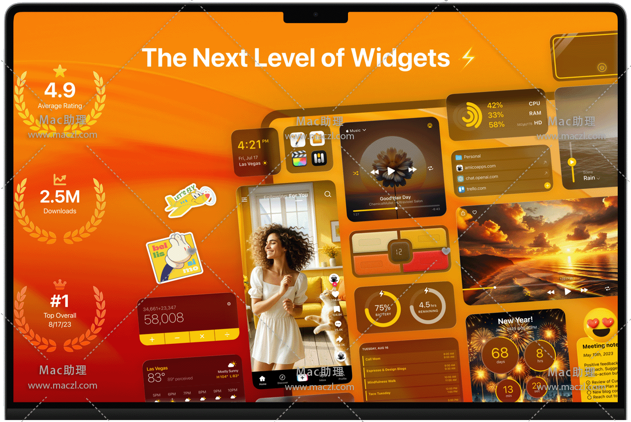使用 WidgetWall 将您最常用的工具放在桌面上,即可快速访问各种 Mac 应用。添加多个时钟和天气小部件、Mac 统计信息等等。