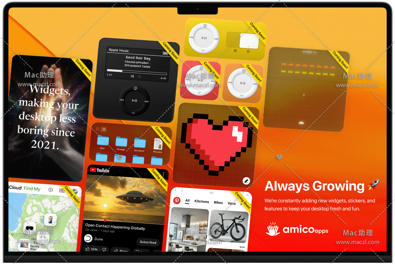 使用 WidgetWall 为您的 Mac 桌面添加小组件。这些小组件始终触手可及,方便您快速访问想要关注的应用、网站或数据。您甚至可以将小组件固定到顶部,使其始终悬浮在其他窗口之上。
