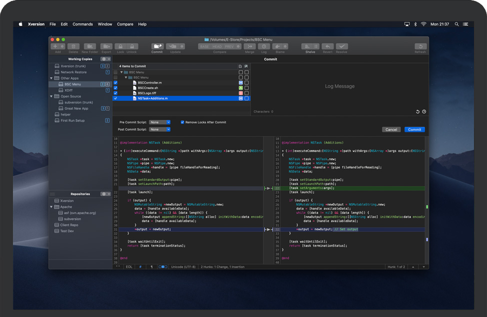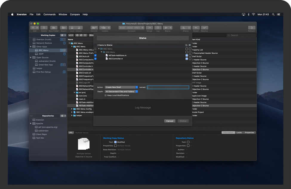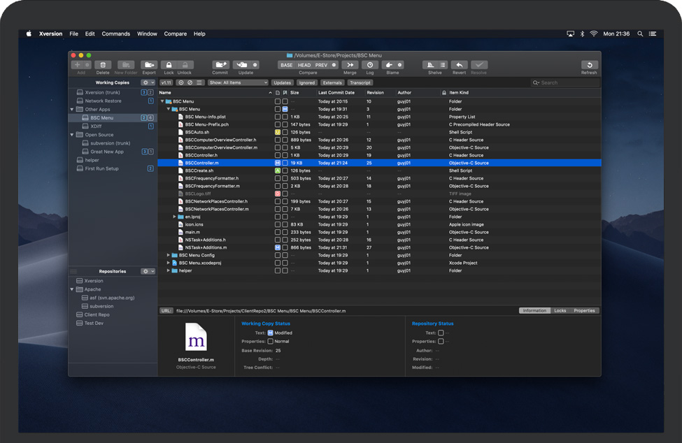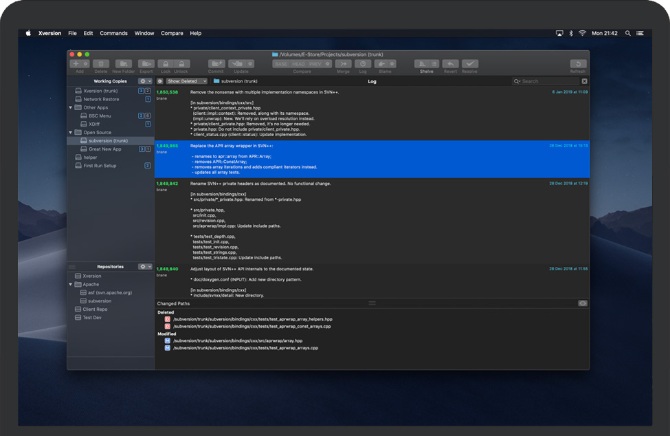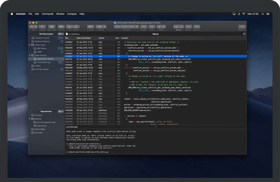 Xversion for Mac 是一款适用于苹果macOS企业级Subversion(SVN)客户端,Xversion功能丰富,速度极快,设计精美。从开始创建存储库到签出、编辑属性、高级合并和比较、解决冲突、提交、更新等等,Xversion都能满足您的需求。它快速、强大、直观且易于使用,您可能永远不需要阅读手册。