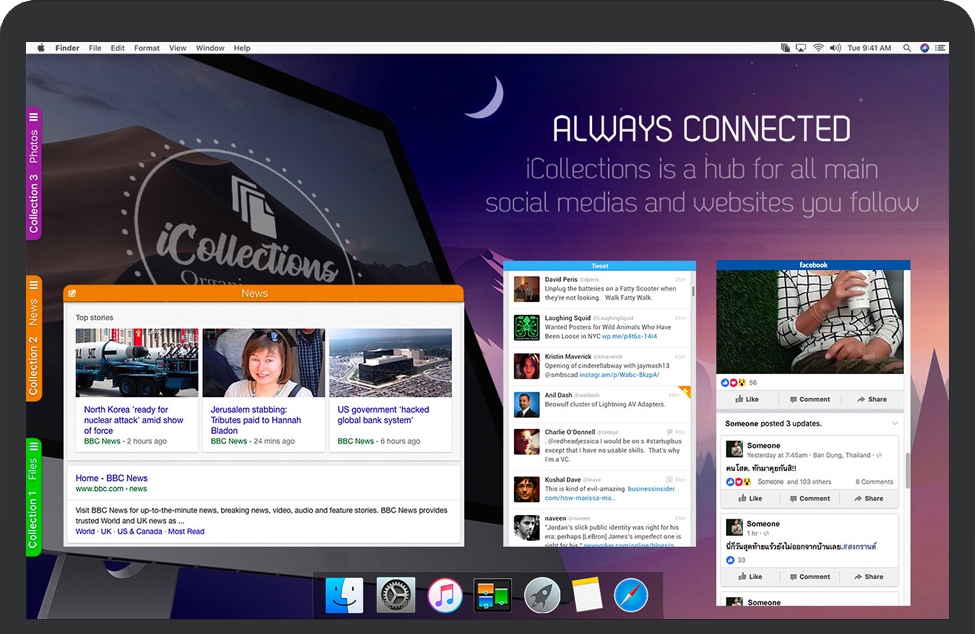 从主菜单中选择相框,在桌面上创建相框。相框将以幻灯片形式显示您的图片集,例如每天新图片。只需选择您的图片文件夹或Photos©应用相册,即可重温您最精彩的时刻。 在桌面上显示您最喜爱的网站-Facebook、YouTube、Twitter、新闻或您选择的任何其他网站。 iCollections不仅提供了一种在桌面上动态存储文件和文件夹的方式,而且还提供了一个精简的桌面,让一切都井井有条,从而提高任务和时间管理效率。 主要功能
