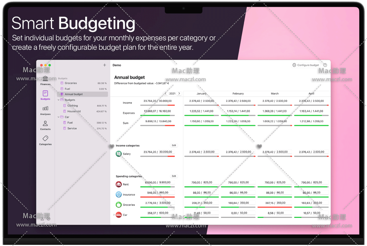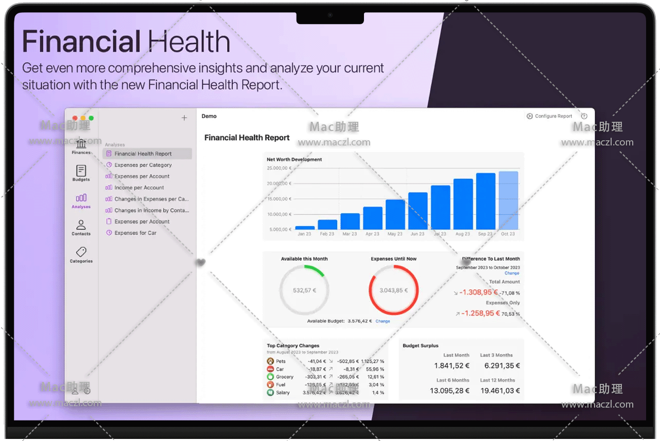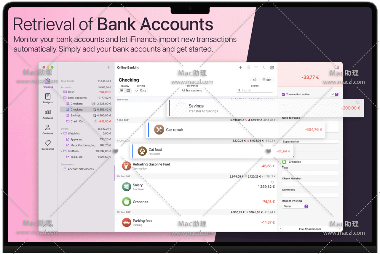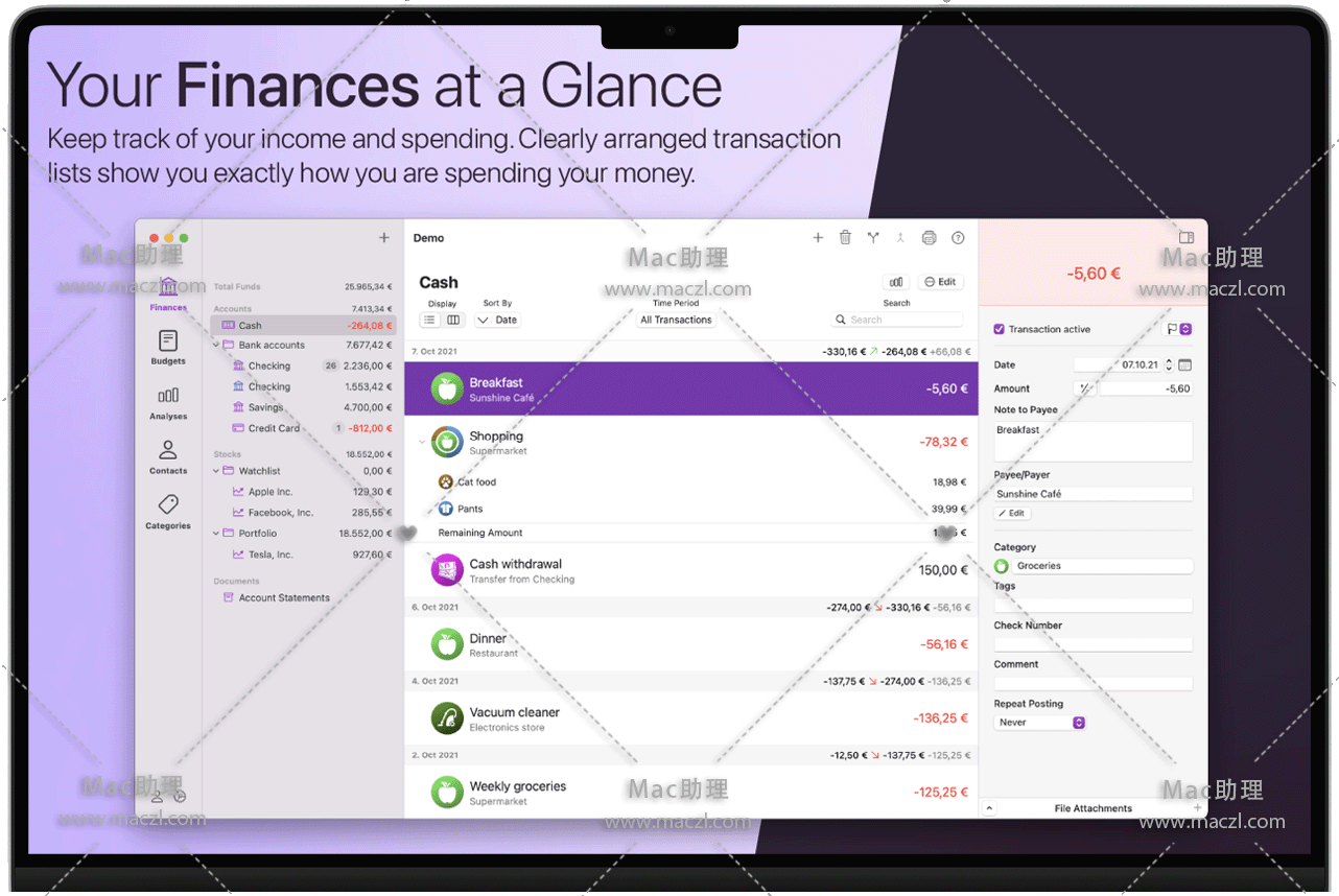 想了解您的资产表现如何吗?或者为什么你每个月都要把银行账户透支,让你想知道你的工资到底花在哪里了?是目前的费用,如租金、保险、食品还是贷款?iFinance for Mac拥有所有答案。它可以分析你的财务状况,帮助你确定你最大的支出项目和任何有储蓄潜力的类别。