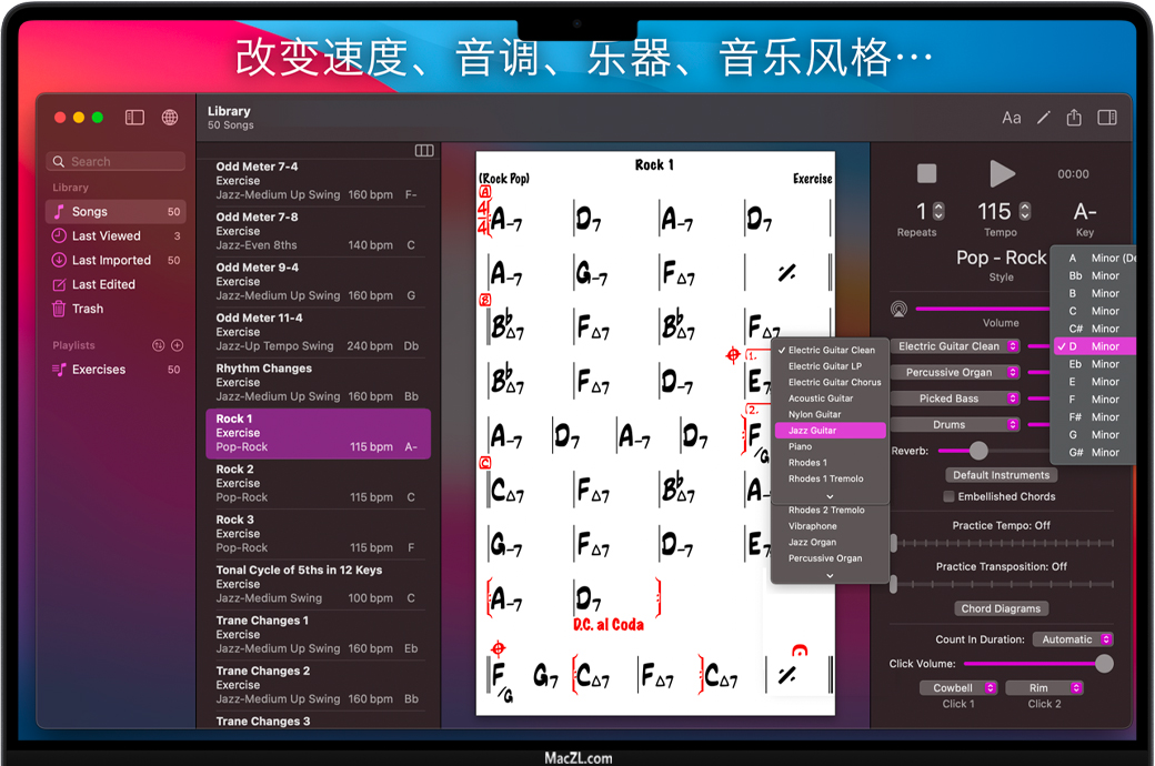 从爵士到拉丁,流行到蓝草,摇滚到雷鬼……与逼真的乐队一起演奏,进行非常有趣的练习。从 50 多种不同的伴奏风格中进行选择,这些伴奏风格有多种乐器可供选择。