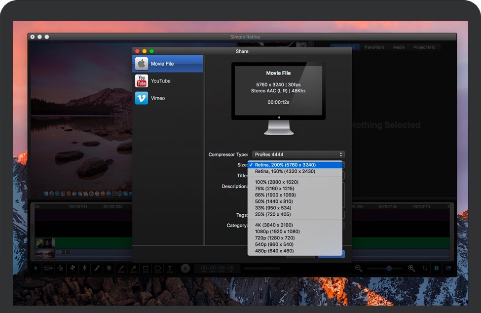 得到您的结果“在那里”!共享/导出面板着重于最终用户的需求。快速时间?没问题。网络?没问题!iDevices 1?是的!1080p?当然!YouTube,还有Vimeo吗?你说对了!