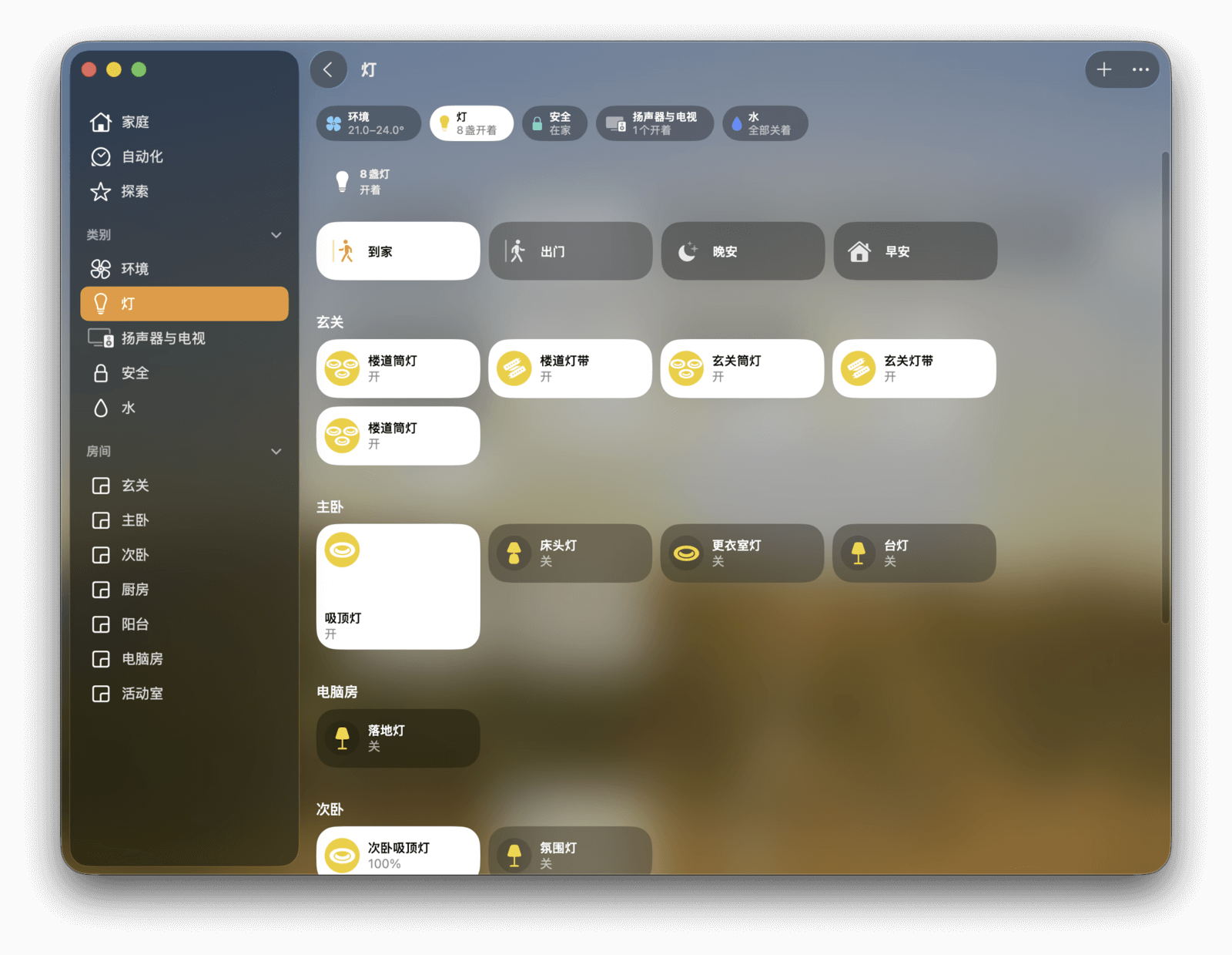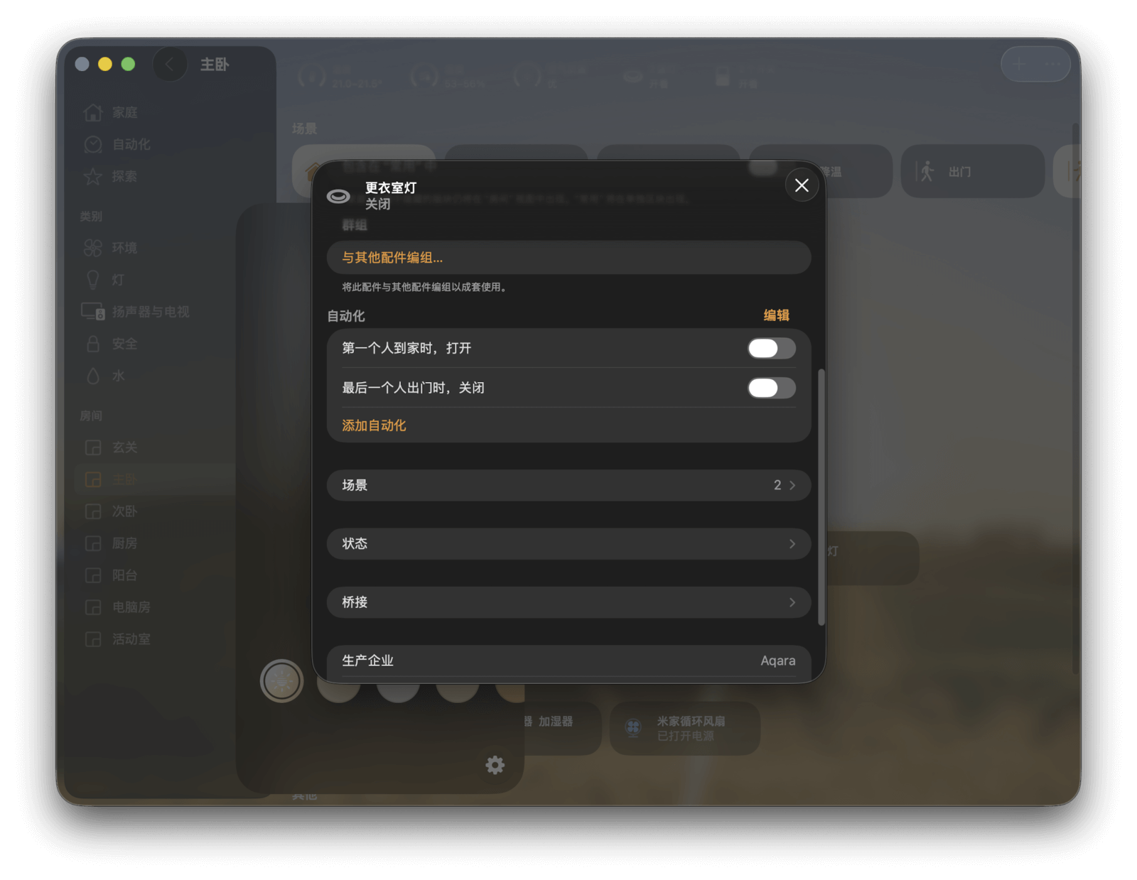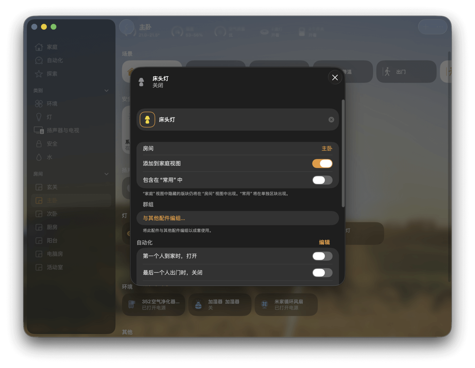 最后是「房间」分组。这里的信息与「家庭」页面类似,但只显示特定房间内的所有设备和场景。