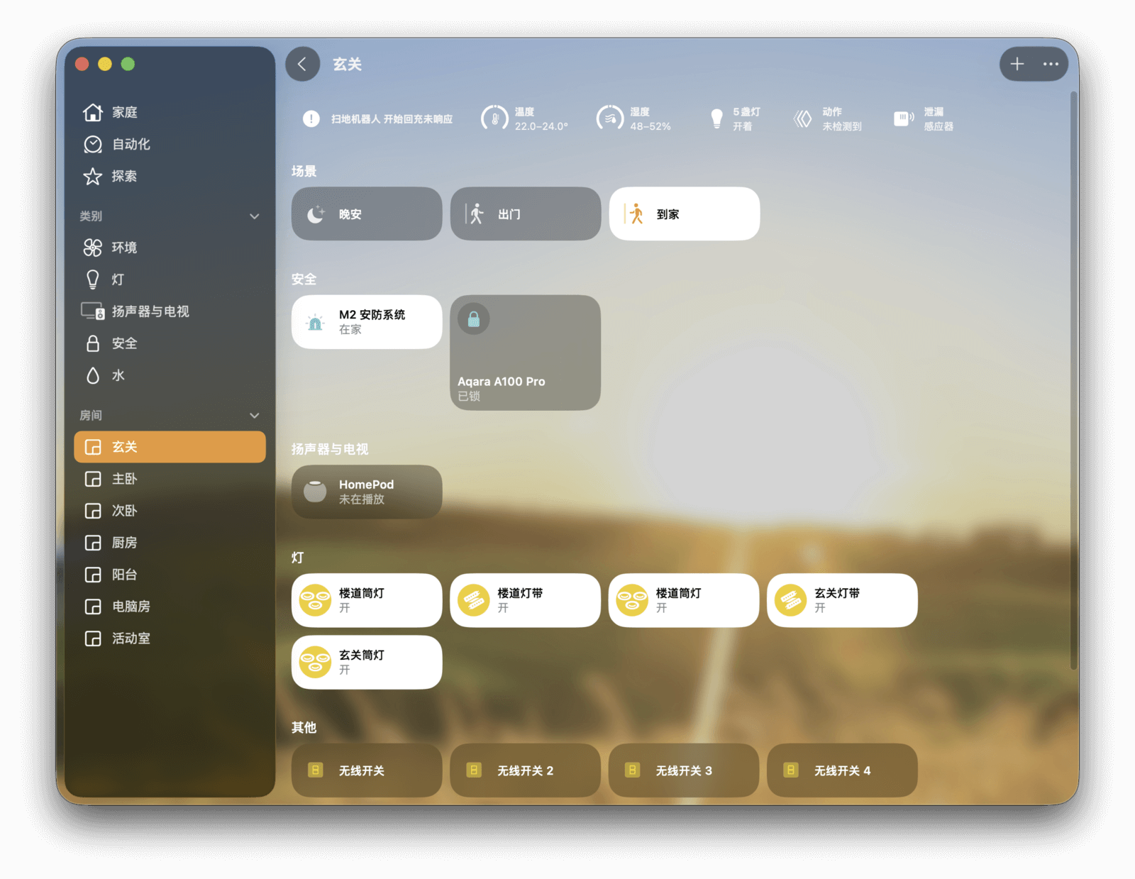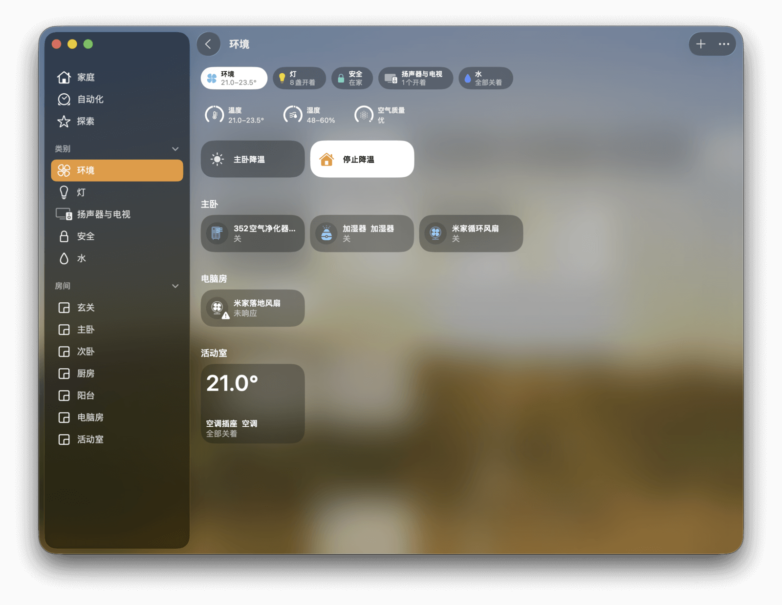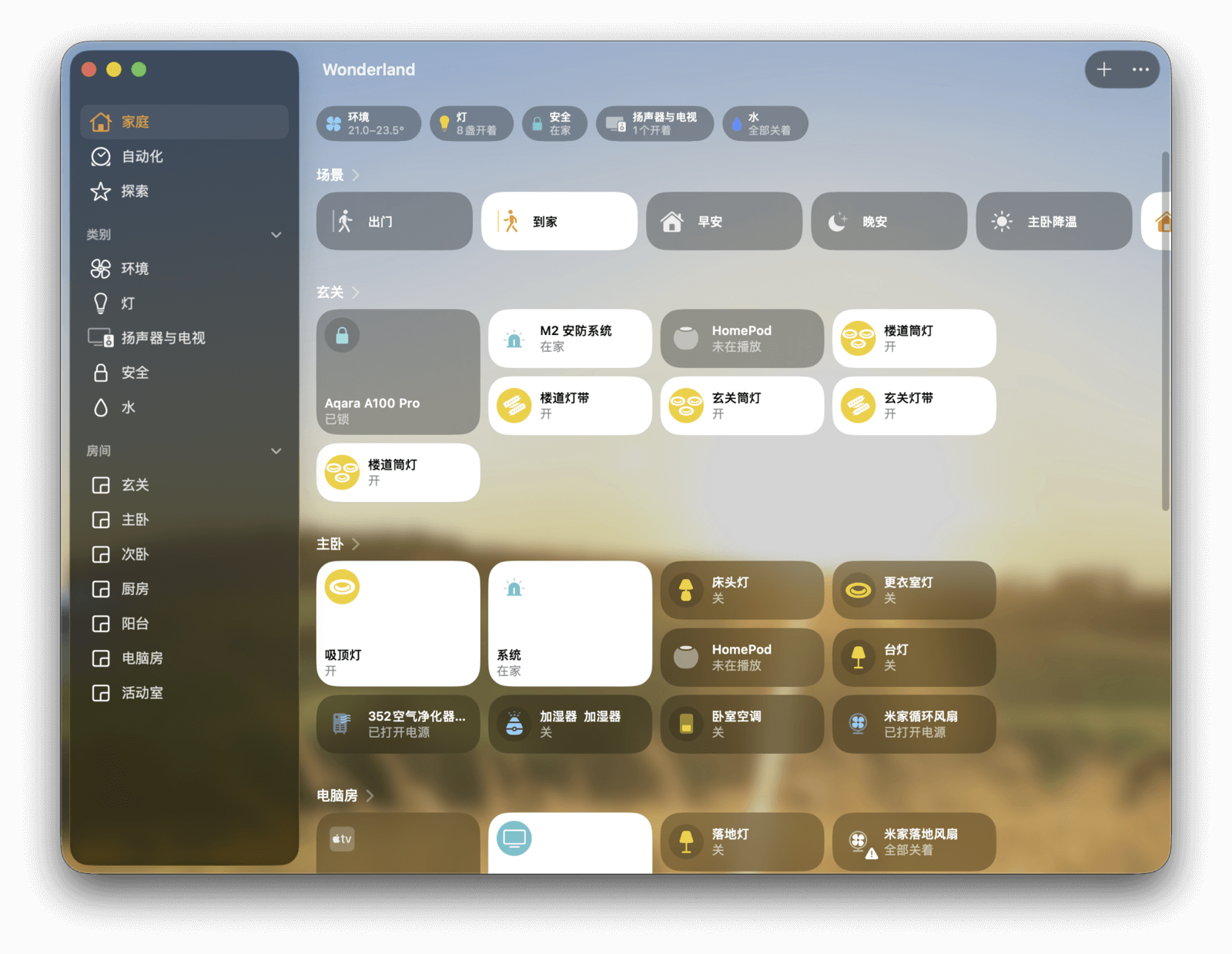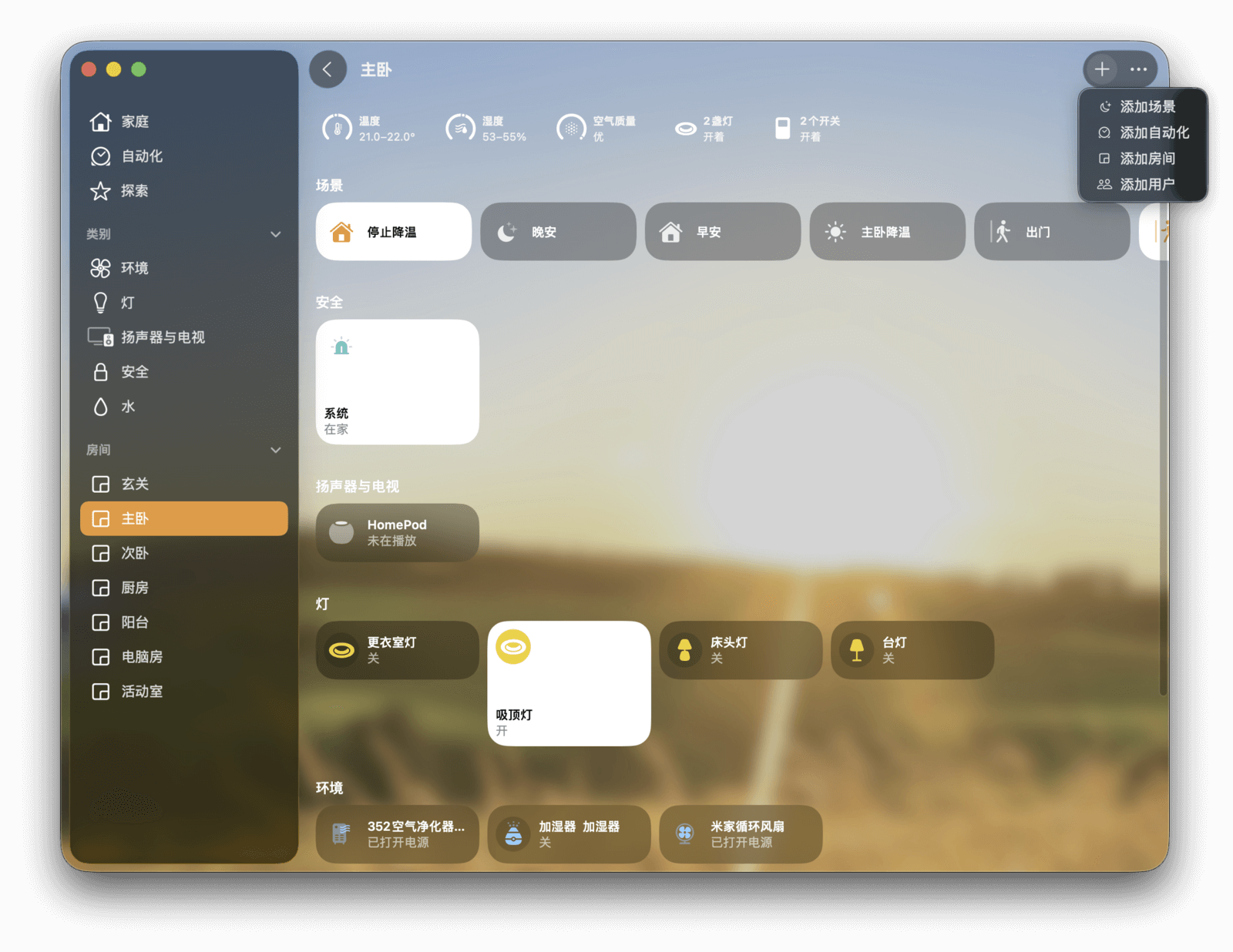 最后是「房间」分组。这里的信息与「家庭」页面类似,但只显示特定房间内的所有设备和场景。