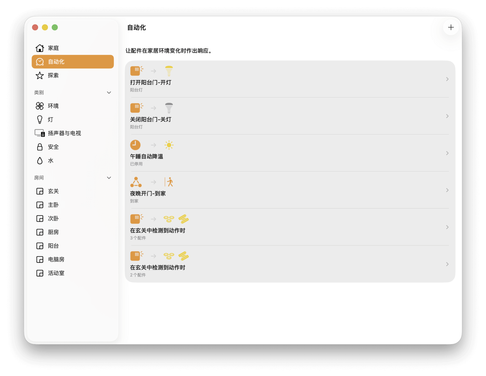 其次是「自动化」页面,这里会以列表形式展示你设定好的家庭自动化。我们常说的智能家居中的「智能」,很大程度上就是靠它来实现的。具体用法我们稍后会讲。