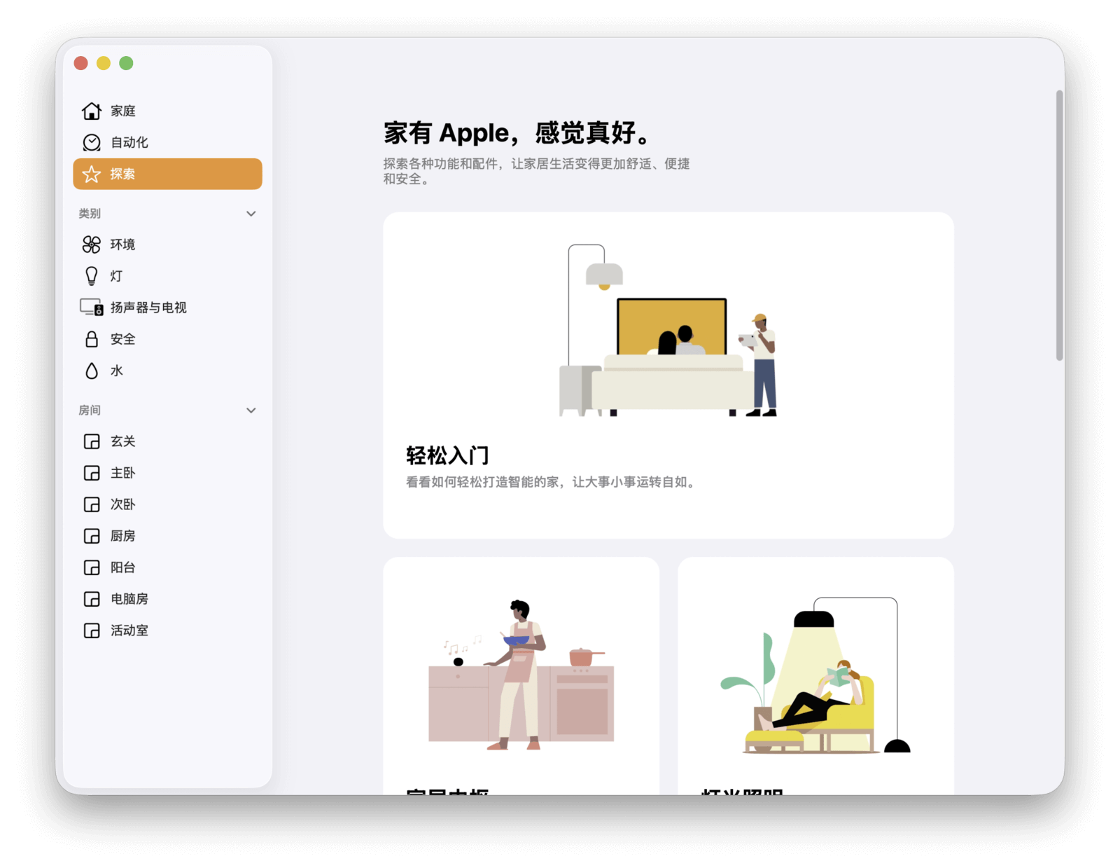 接着是「探索」,这里展示了 Apple 官方的 HomeKit 教程和配件选购入口。