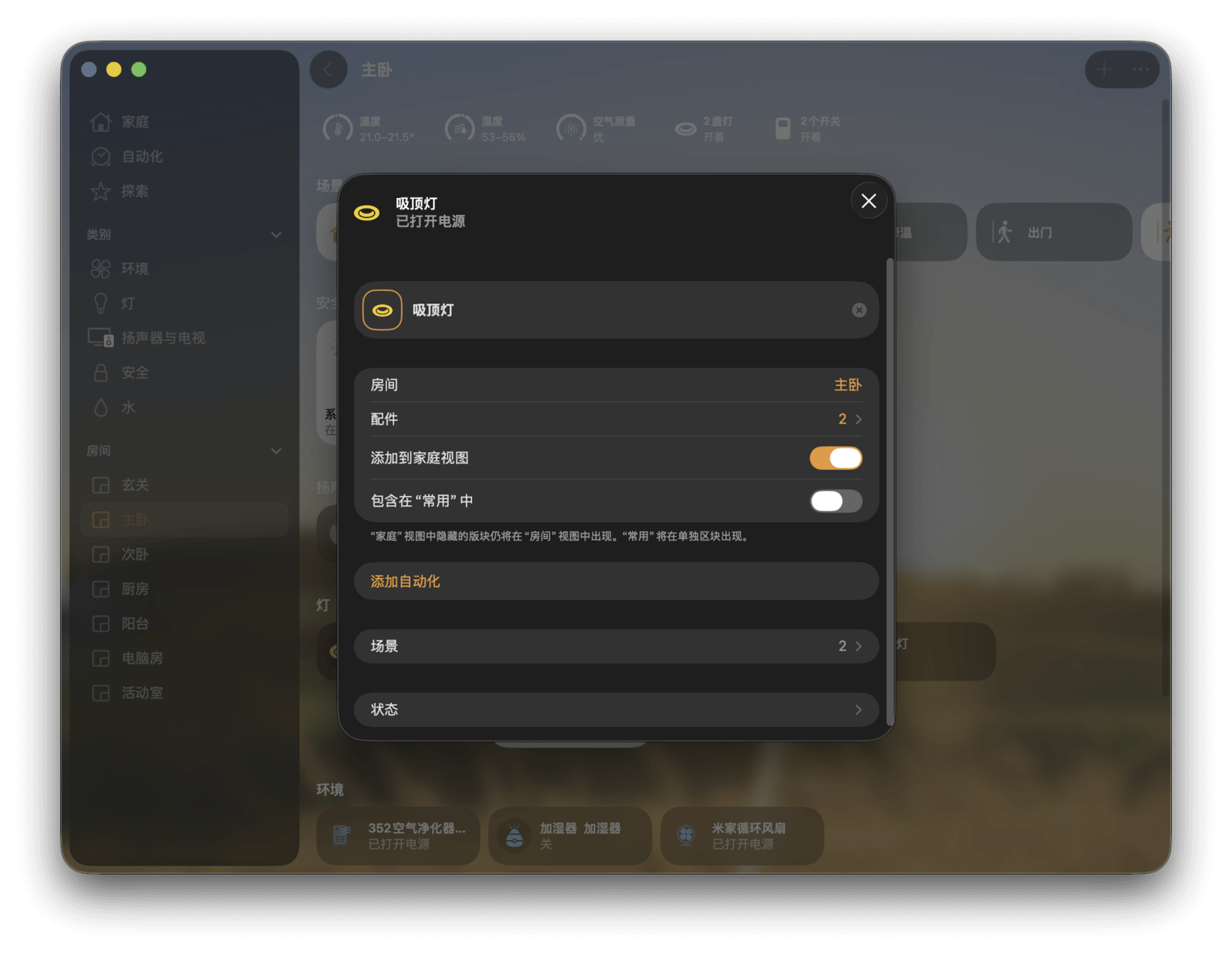 要将它添加到「家庭」页面的“常用”中也很容易。按照分配房间的操作进入详细设置,在房间列表下方有一个「包含在“常用”中」的开关,打开它,你就可以在「家庭」页面中找到这个设备了。