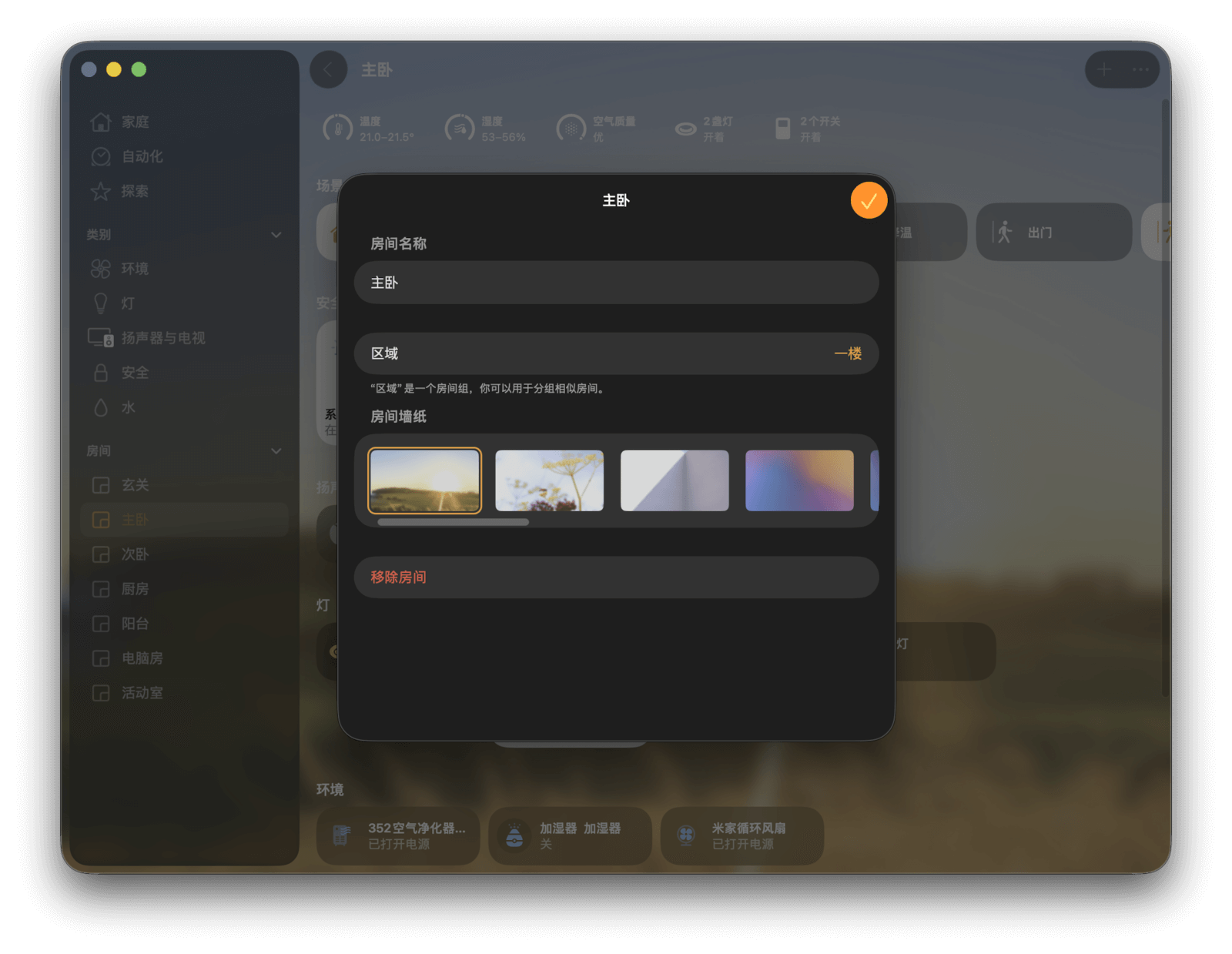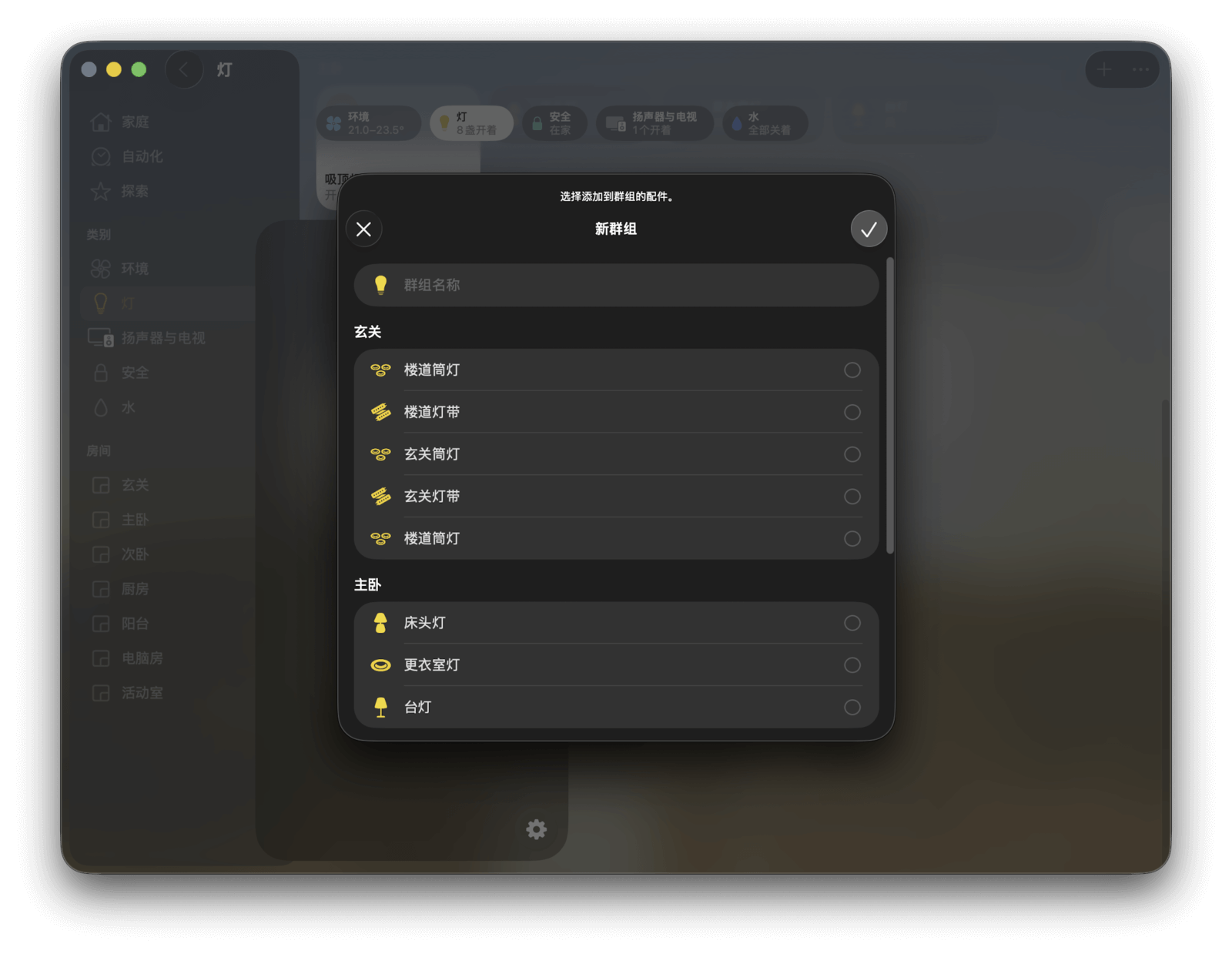 注意,你选择的第一个设备会决定该场景默认分配到的房间。例如,第一个设备在主卧,那么这个场景就会出现在主卧的页面中。