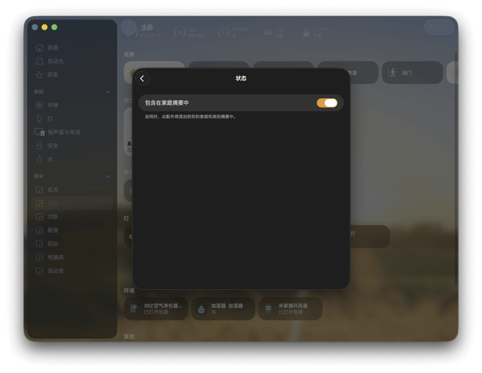 最后,你还可以手动设定某个设备是否出现在状态中。操作方法与上文「包含在家庭摘要中」类似,这里不再赘述。