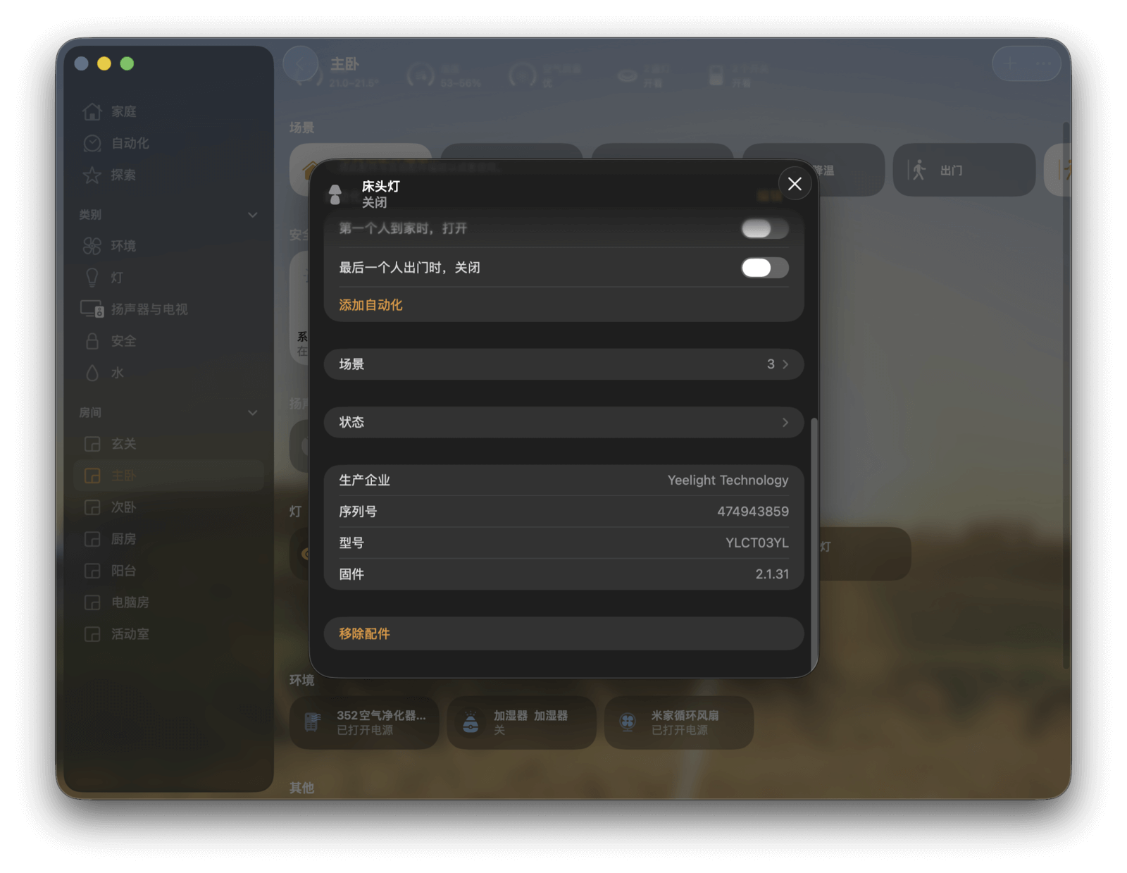 当某些设备损坏或不再使用时,我们就需要将其移除。在家庭 app 中移除设备的操作同样非常简单:找到对应设备,点击进入详细设置,划到最底部就能看到「移除配件」的按钮了。点击它,然后选择「移除」即可。