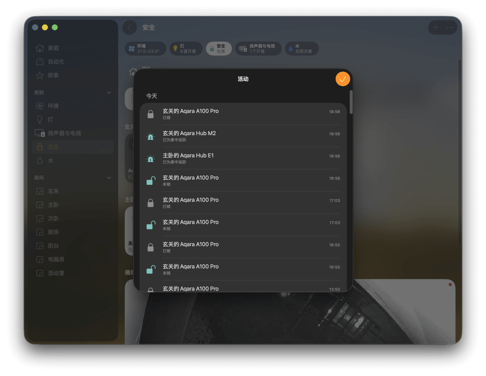 Apple 还为门锁、安防系统、门窗感应器等安全类设备加入了活动历史记录功能。你可以通过点击主界面顶部的「安全」按钮来一键查看。若想查看这类设备的活动历史记录,点击「安全」按钮后就可以看到「活动历史记录」功能,单击后即可查看每一次设备状态变更的详情。