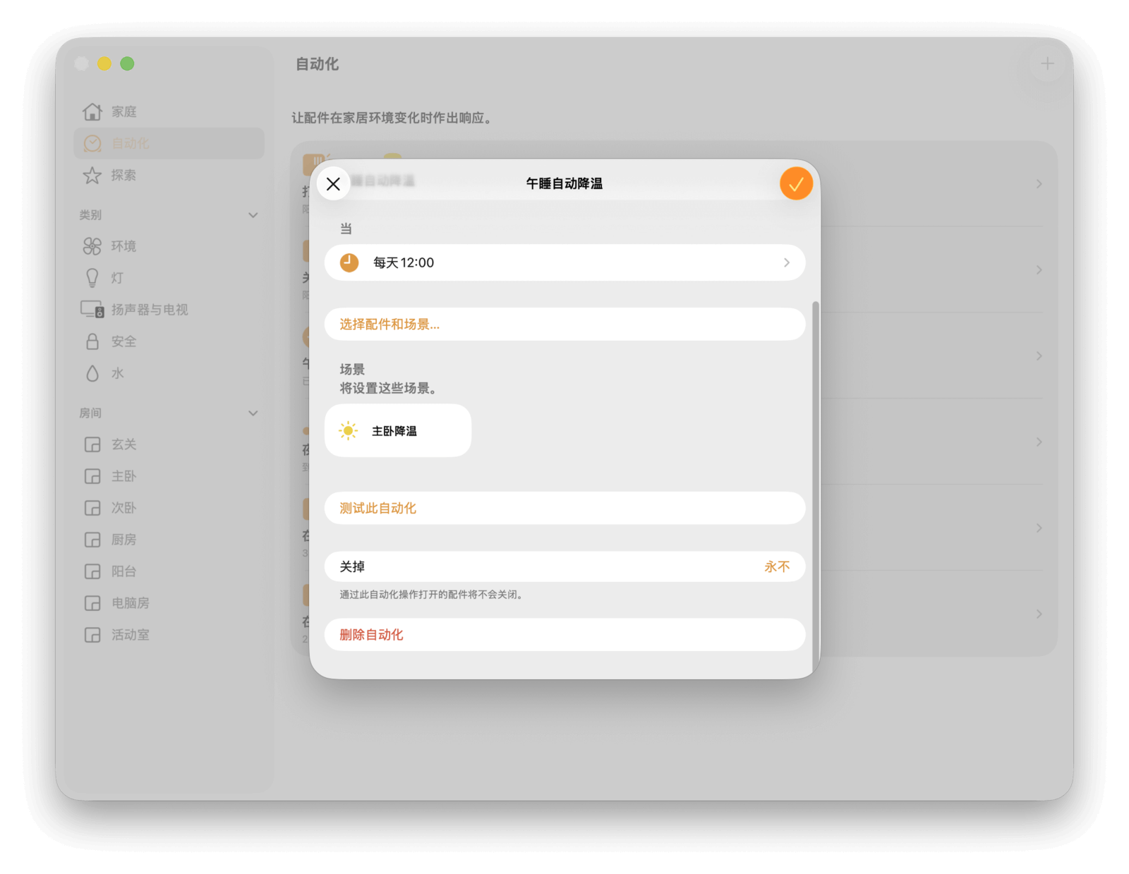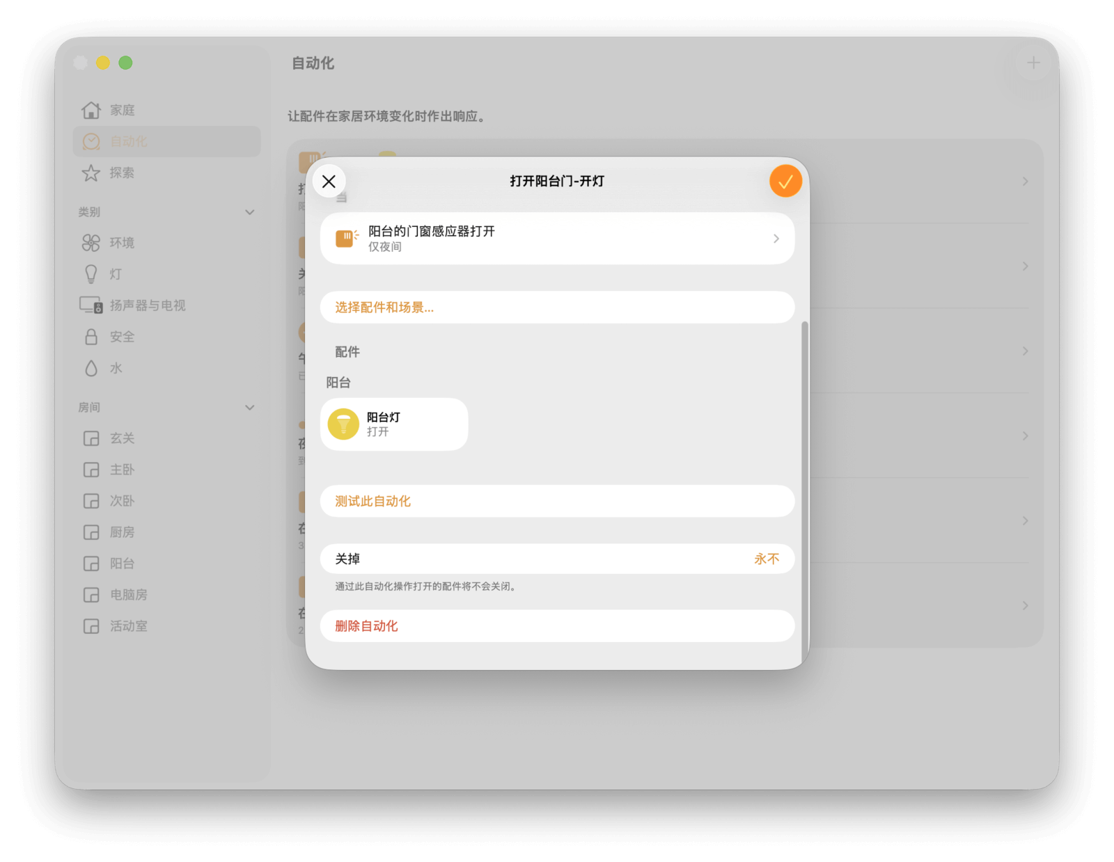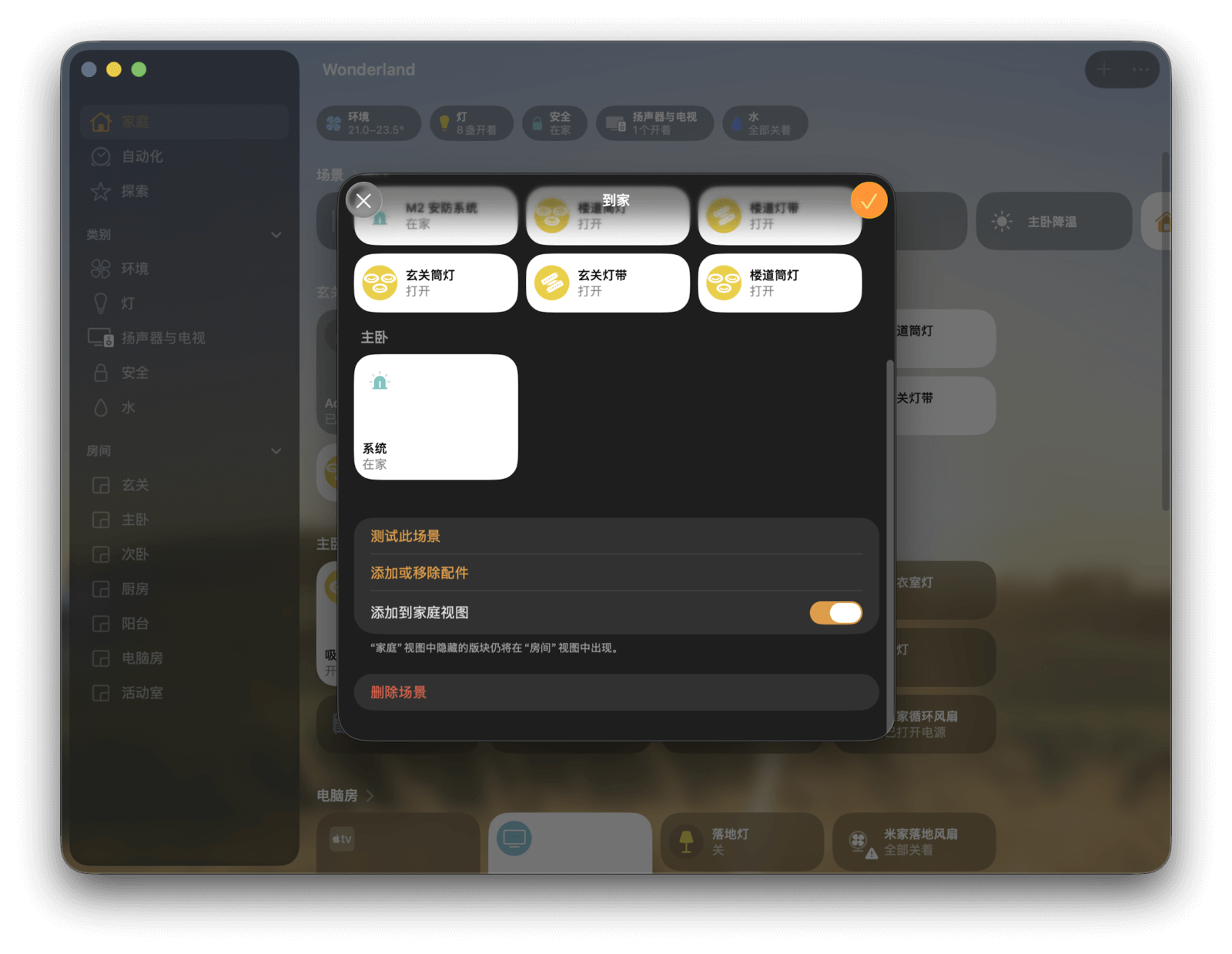 设置完成后,你可以点击「测试此场景」来检查效果,或点击「添加配件」来继续增减联动的设备。