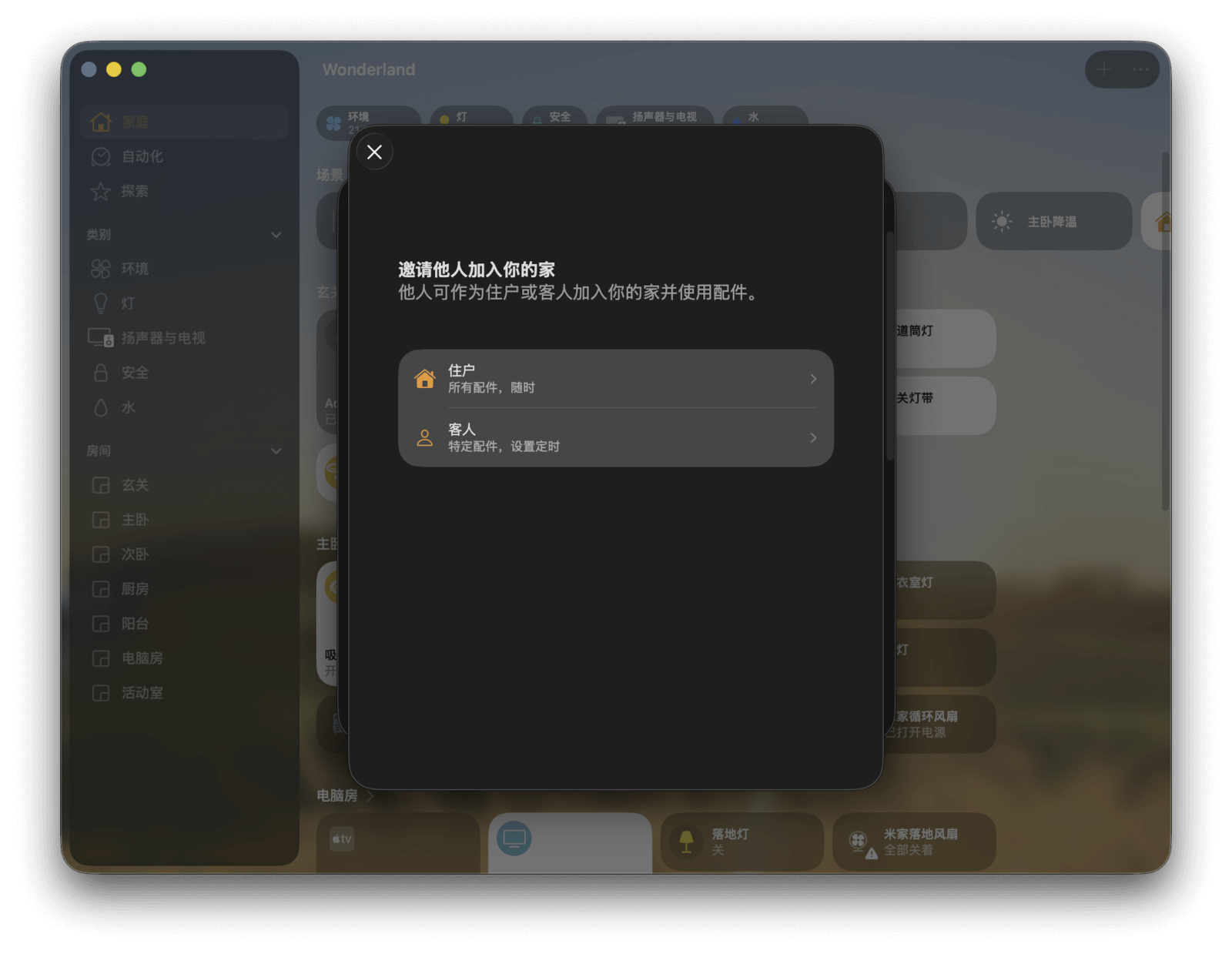 邀请他人控制家中的设备