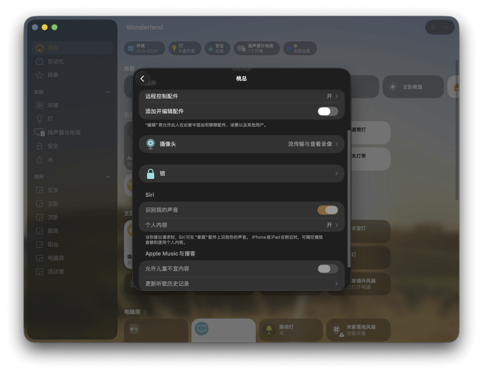 在 macOS 13 及之后版本中,家庭 app 的界面采用了全新的设计风格,从以往的底部标签页改成了侧边栏,令浏览、整理、查看和控制各种配件更加轻松简单。