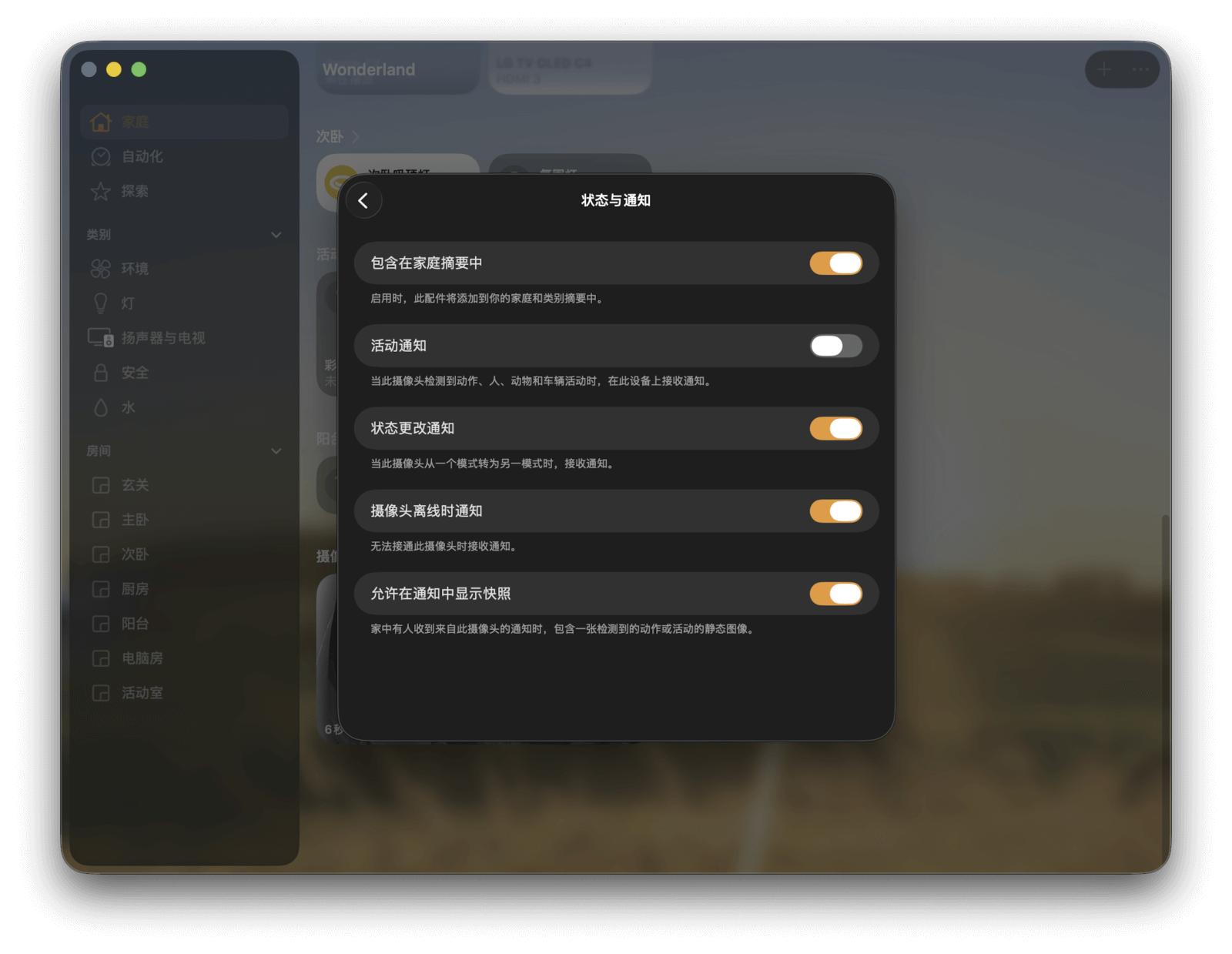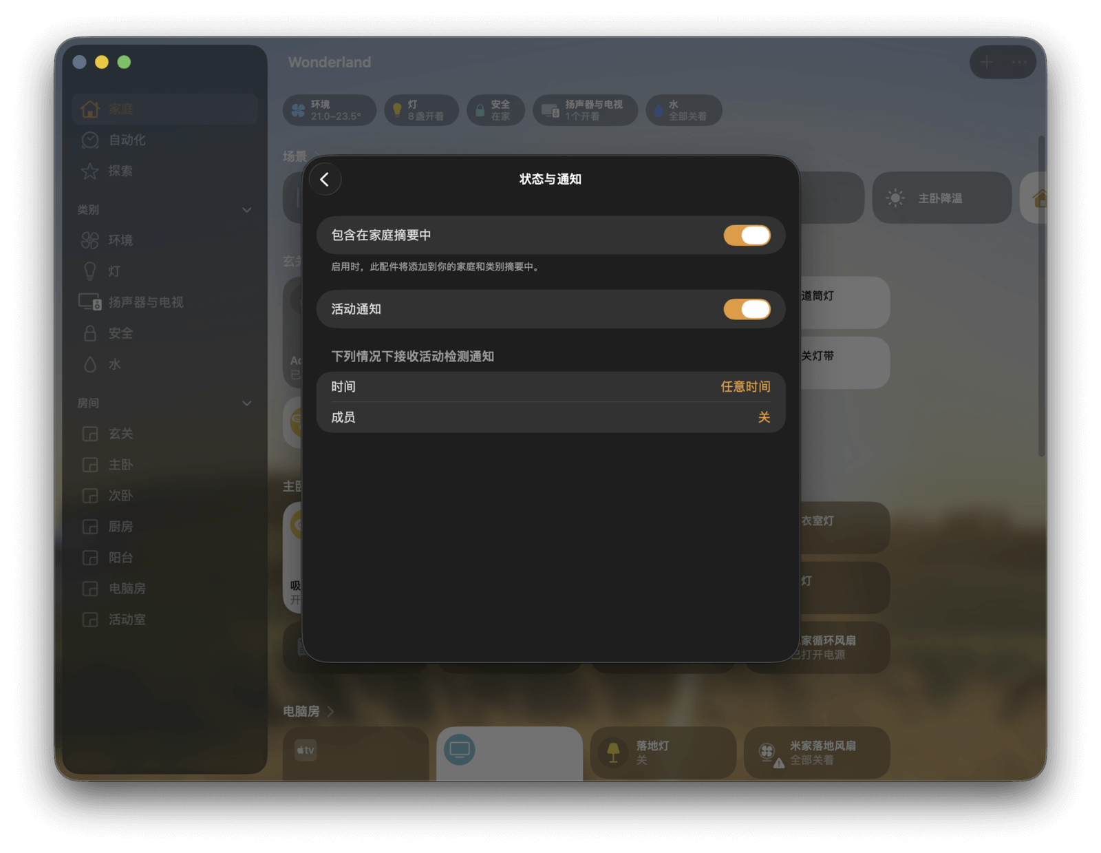 对了,有些设备的通知管理也可以在「状态」页面中设置,操作方式与「查看设备和家庭状态」部分提到的类似,这里就不再展开了。