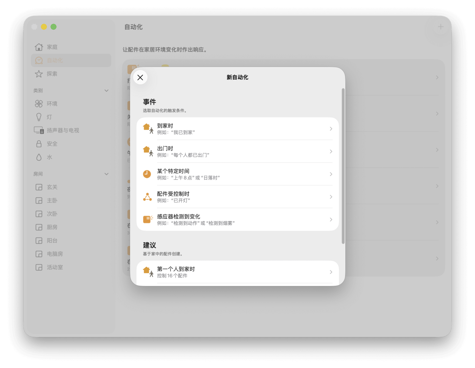 想要创建自动化,在家庭 app 的任意页面点击右上角的「+」按钮,选择「添加自动化」,即可开始设置。