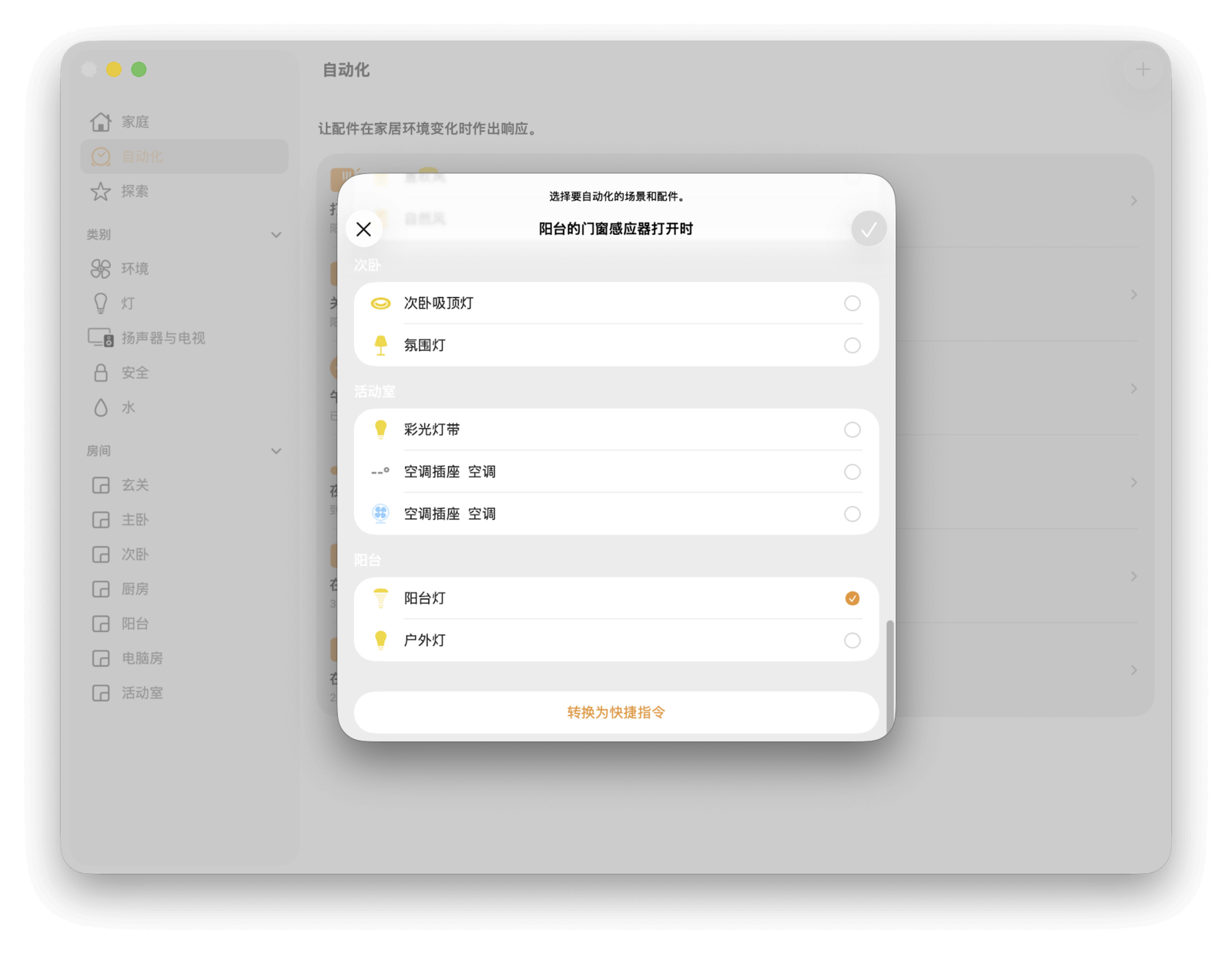 在选择配件的界面下方,你还可以看到一个「转换为快捷指令」的选项——这同样也是 Apple 生态的一个杀手锏功能。点击它,就可以将自动化转换为一个由家庭 app 触发的快捷指令。这样一来,你不仅可以控制 HomeKit 智能家居设备,还可以联动 iPhone、iPad、Mac 等 Apple 设备或其他 app,实现更强大的自动化。