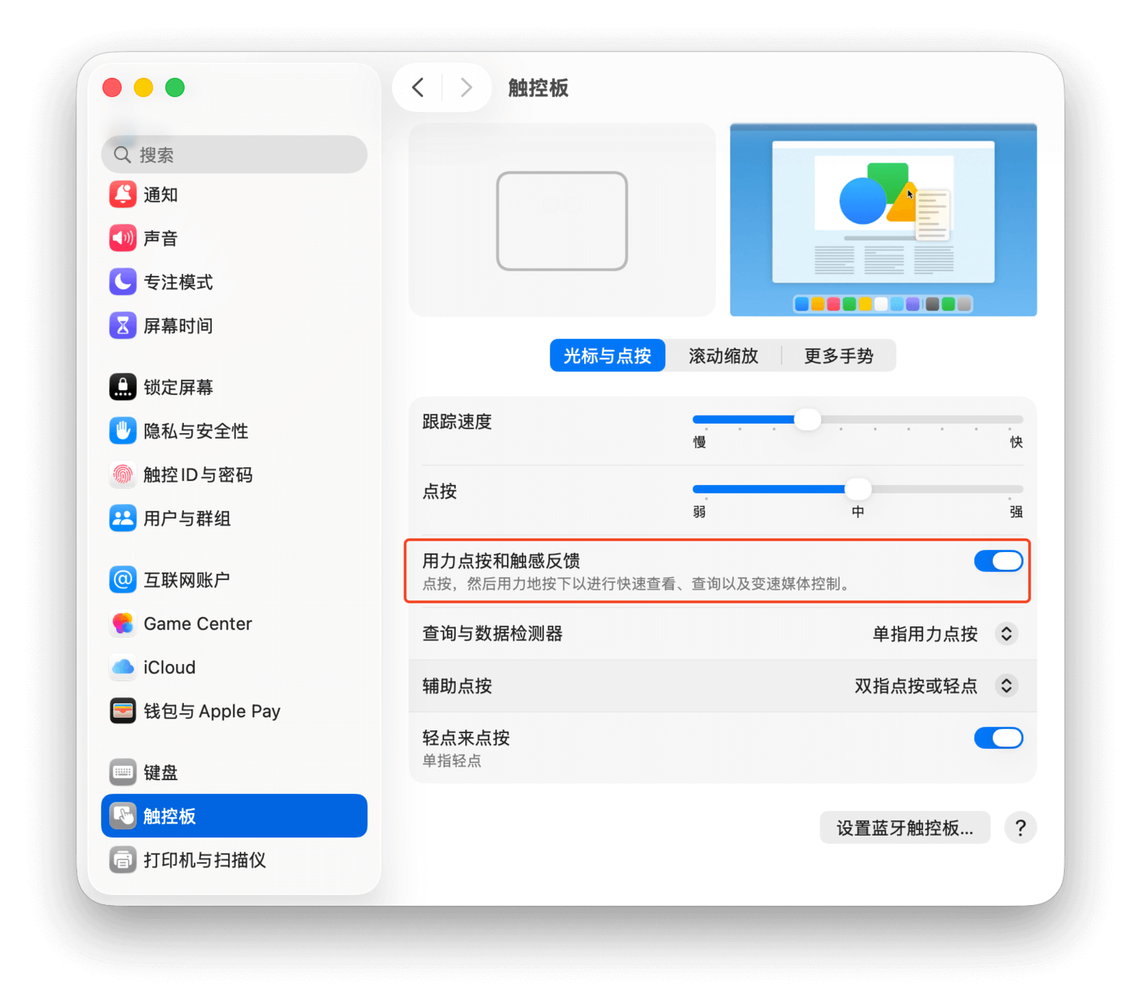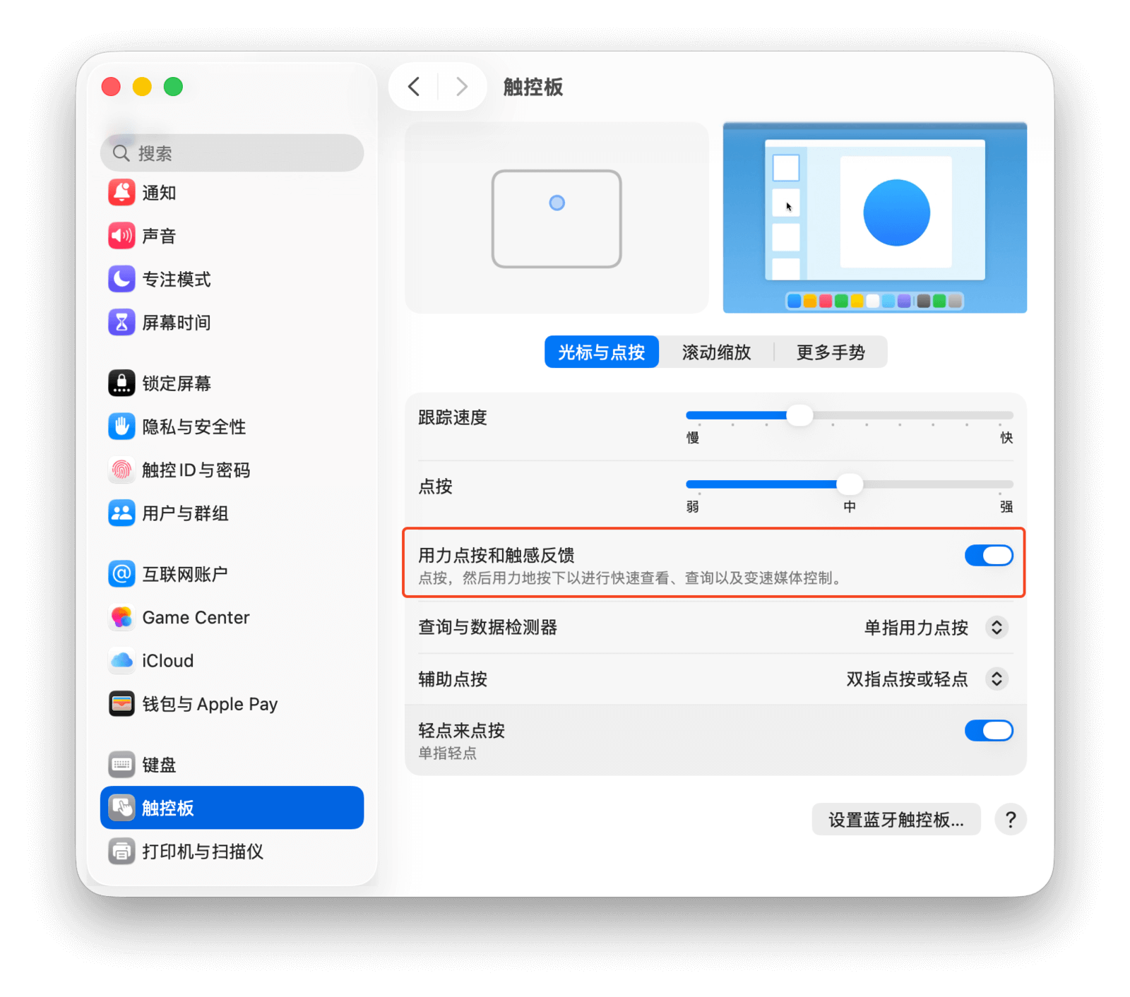 「点按」滑块用于调节触发点按所需的力度。例如,将滑块调至「强」,则需要更用力才能「按下」触控板。