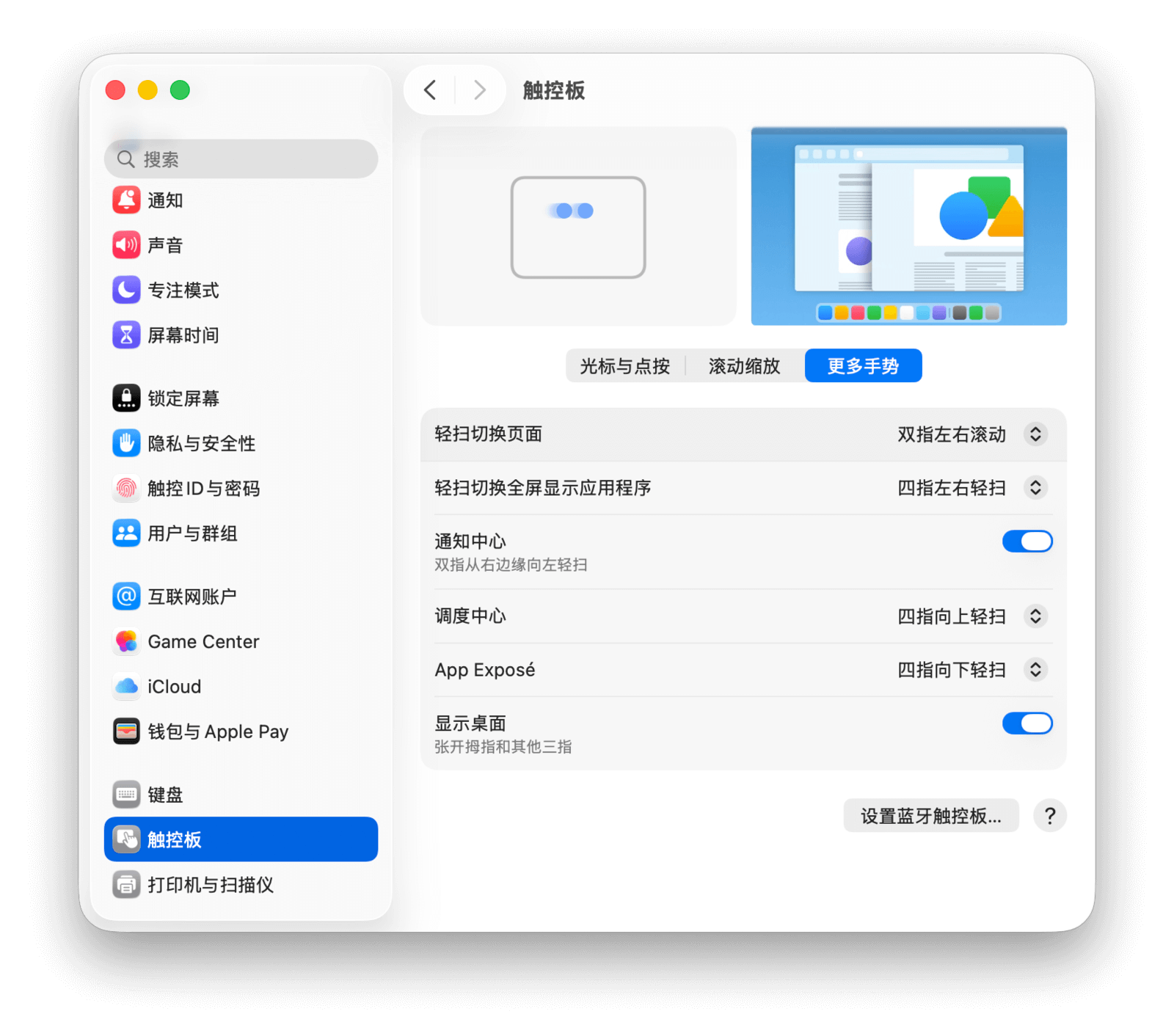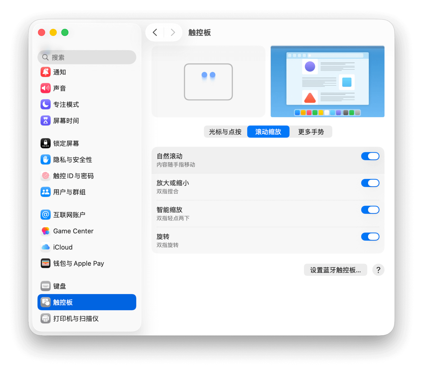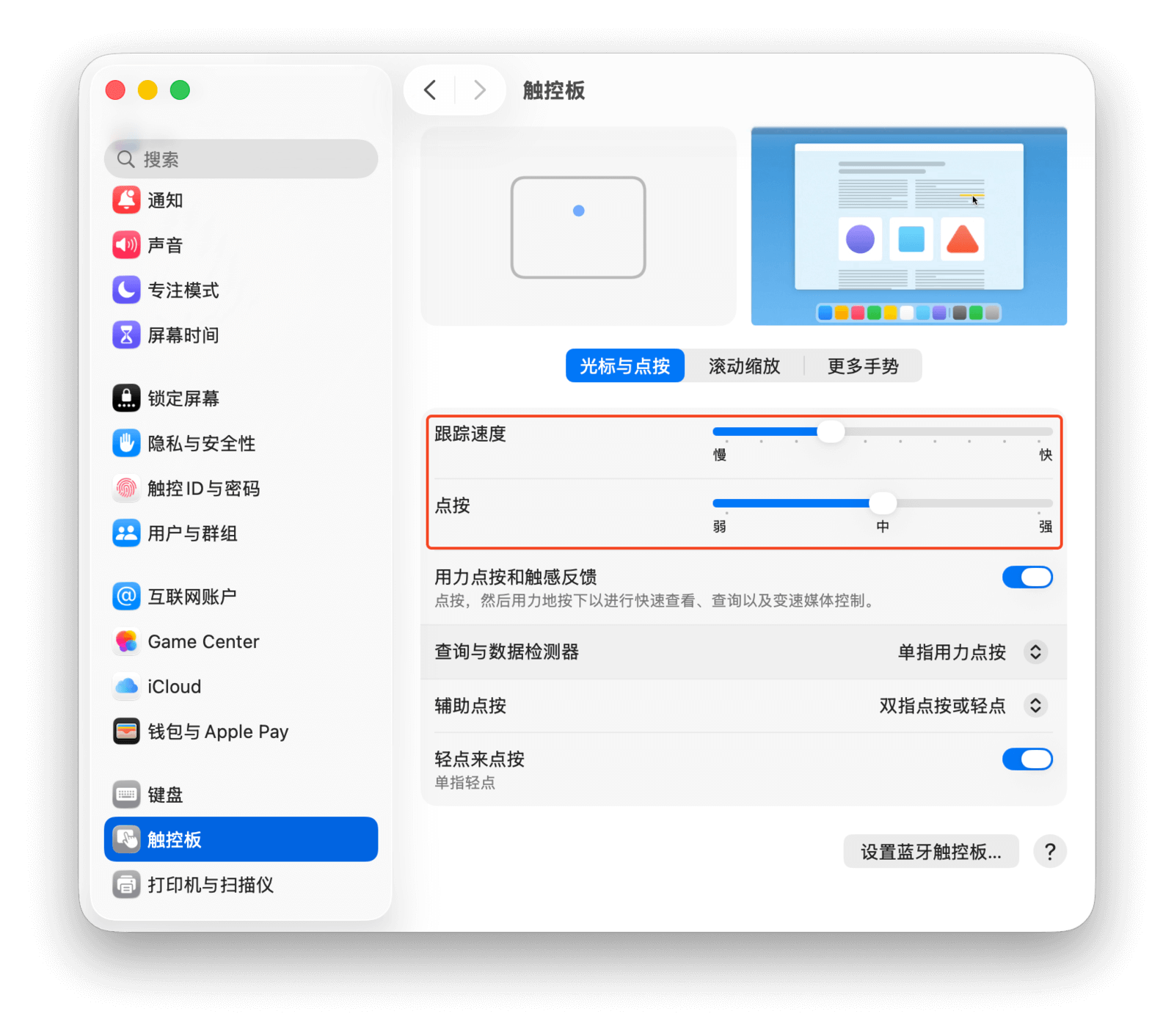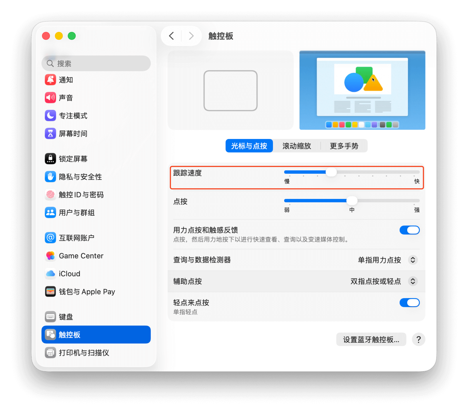 在 Mac 上前往「系统设置 > 触控板」,即可对触控板进行全局调整。