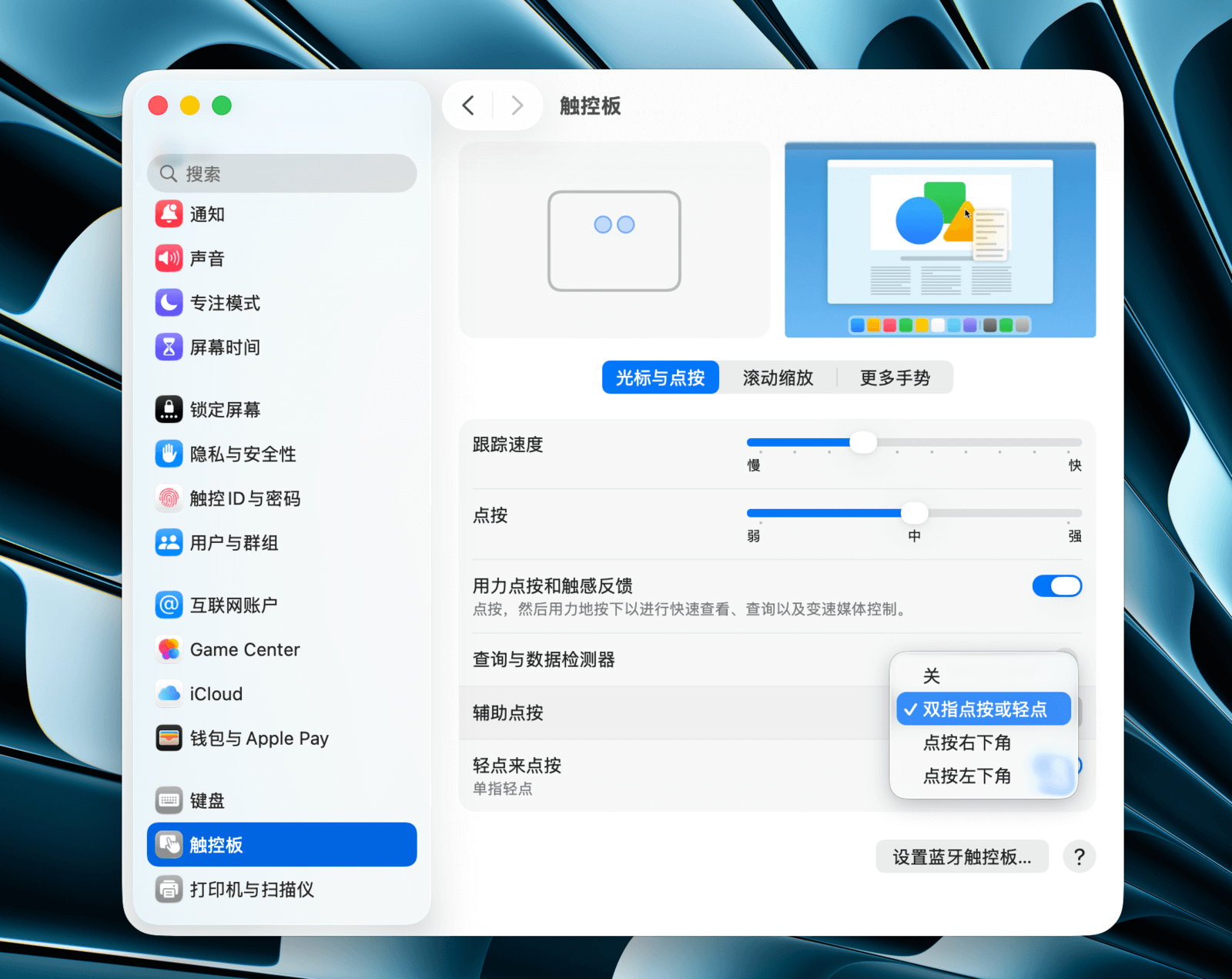 默认设置下,用双指同时点按触控板即可触发辅助点按。你可以在「系统设置 > 触控板 > 光标与点按」的「辅助点按」下拉菜单中更改此设置。