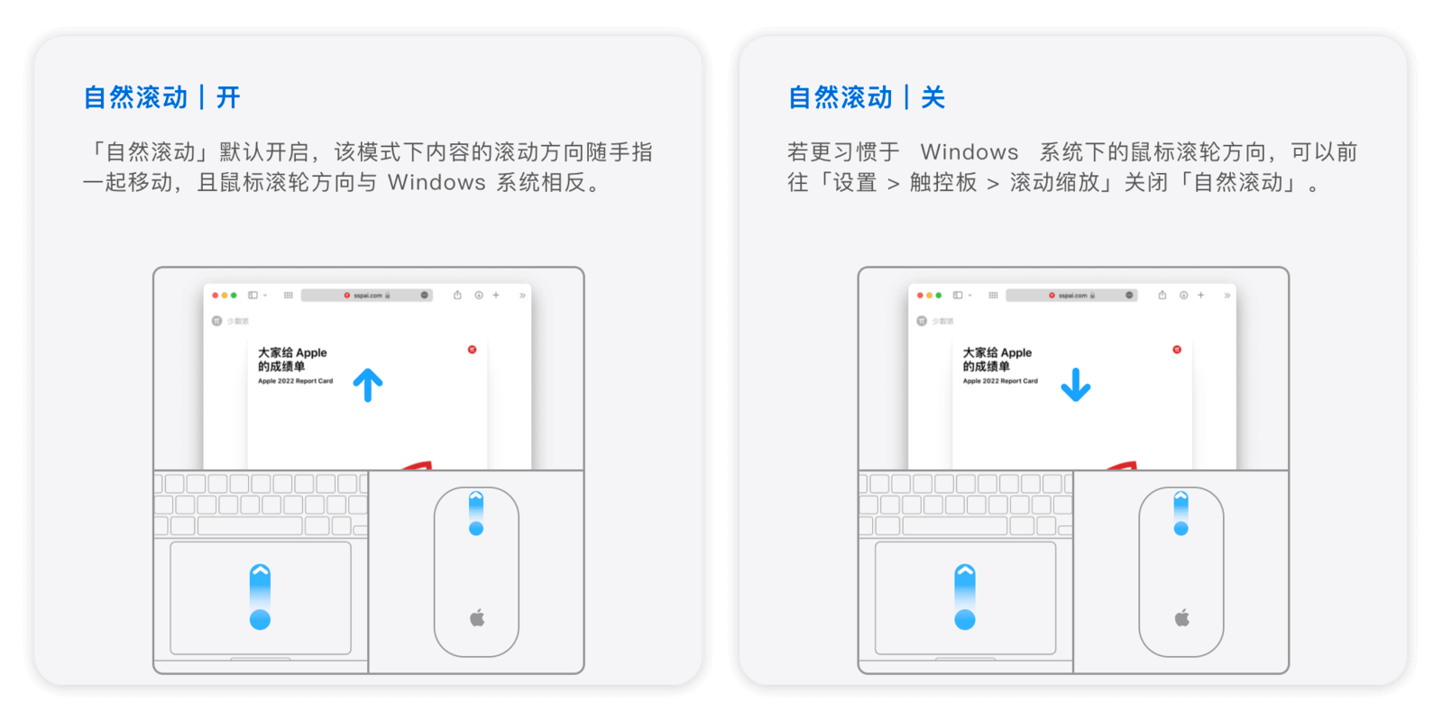单指或双指在妙控鼠标表面滑动可以滚动屏幕内容。例如,浏览网页时,上下滑动可以翻页。