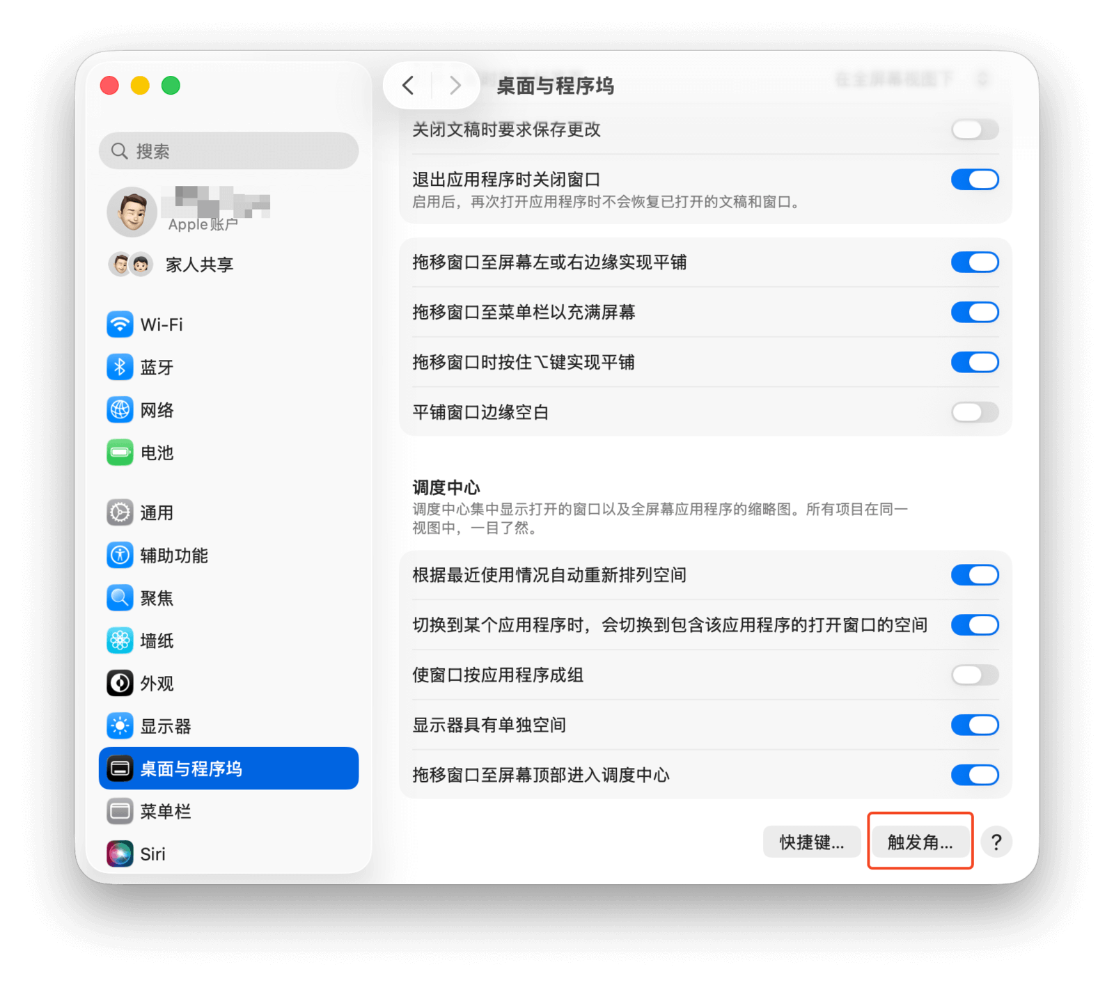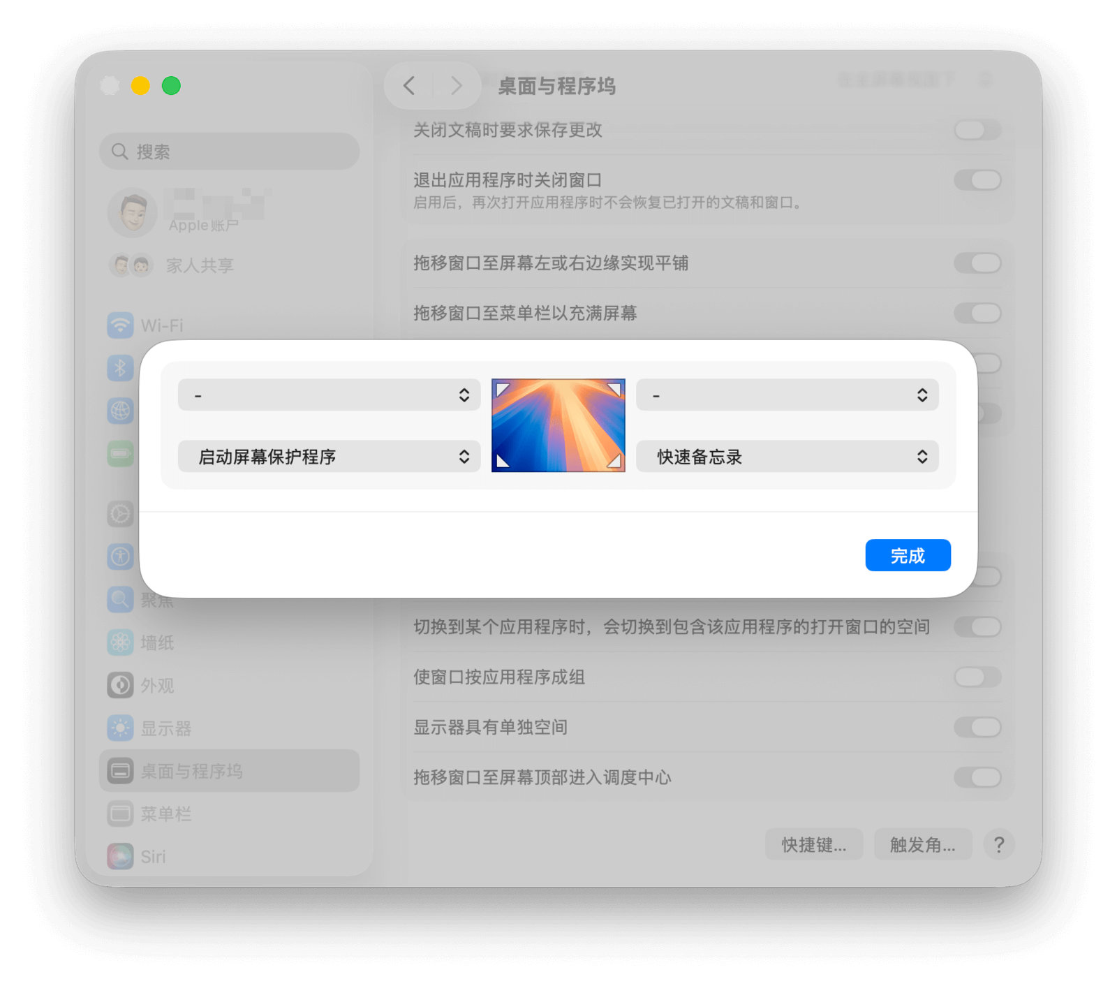 前往「系统设置 > 桌面与程序坞」,点击窗口最下方的「触发角」按钮,会打开下图所示的设置界面。