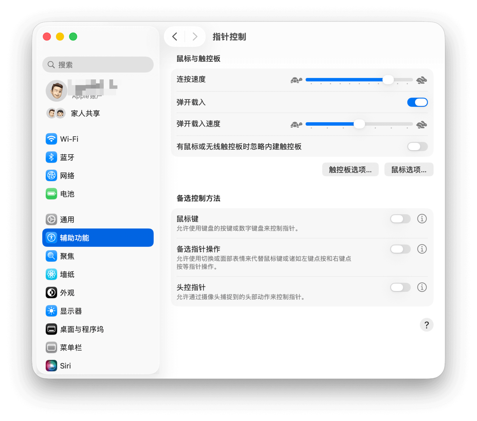 前往「系统设置 > 辅助功能 > 指针控制」,可以配置与鼠标和触控板相关的辅助功能。