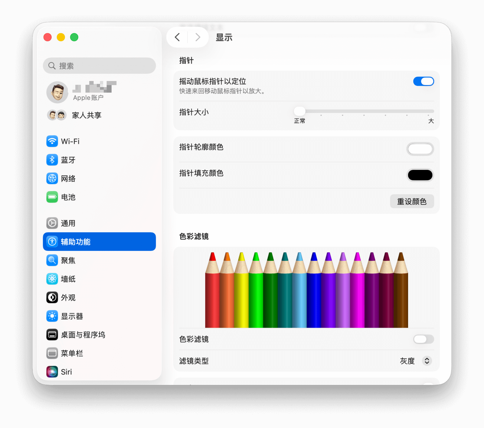 前往「系统设置 > 辅助功能 > 显示 > 指针」,可以配置与鼠标指针相关的辅助功能。