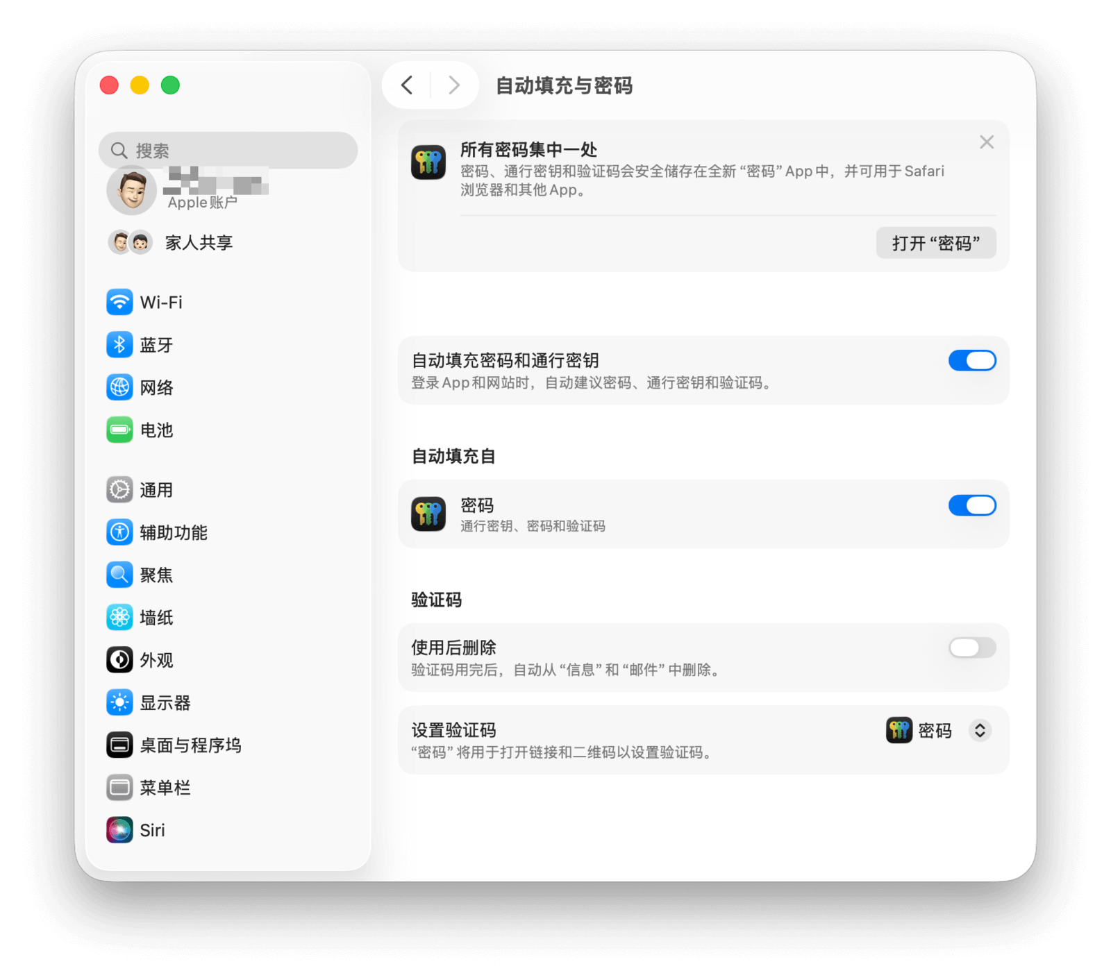 你可以在「系统设置 > 密码」中检查并管理相关的自动填充设置,确保「自动填充密码和通行密钥」的选项处于开启状态,即可在 App 和网页中实现密码自动填充。