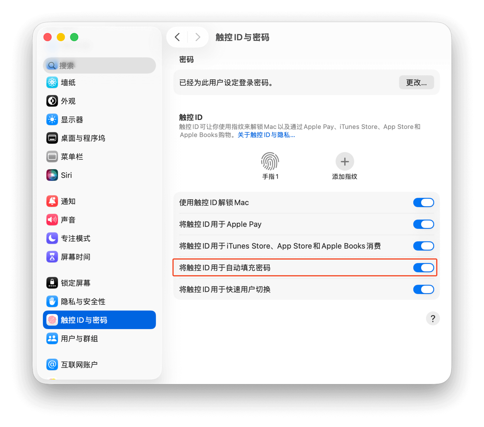 如果你不希望其他人在使用你的 Mac 时通过自动填充功能登录你的账户,可以使用设备的指纹识别功能来保护密码(需要 Mac 支持触控 ID)。前往「系统设置 > 触控 ID 与密码」,在菜单中勾选「自动填充密码」即可。这样,在自动填充账户和密码之前,你的 Mac 会首先要求验证指纹信息。
