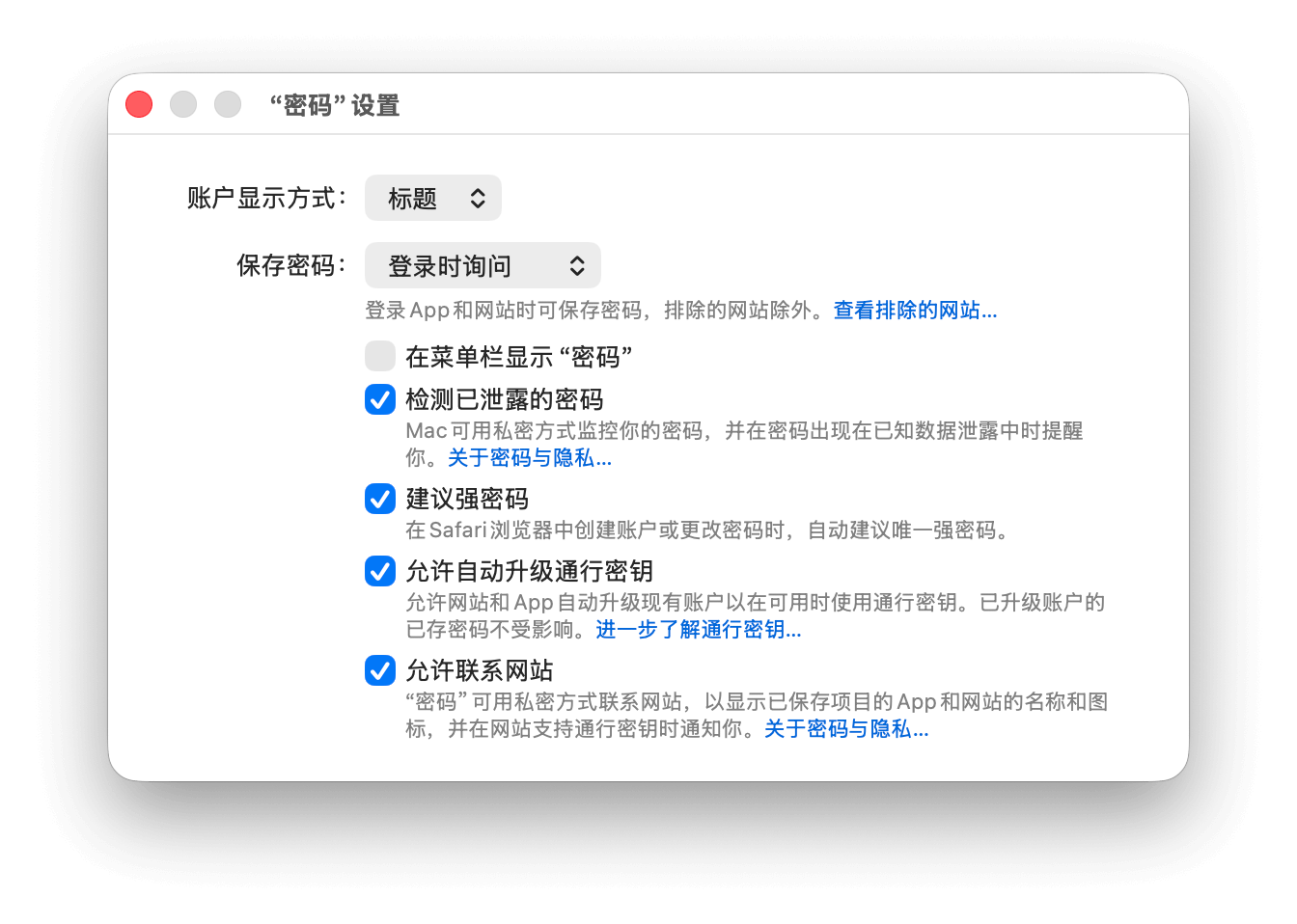 如果发现你的密码有泄漏的可能,密码 app 会提醒你尽快更改,防止账号被盗。如需使用此功能,可以在菜单栏前往「密码 > 设置…」,并在界面中勾选「检测已泄漏的密码」。