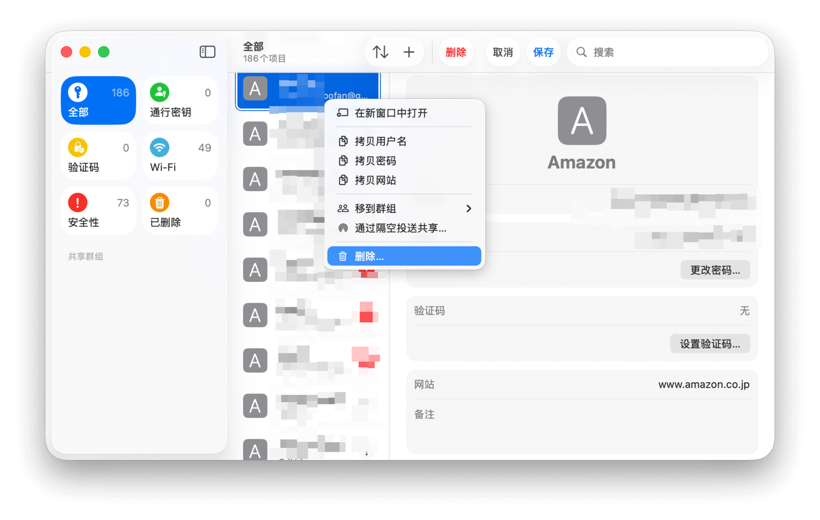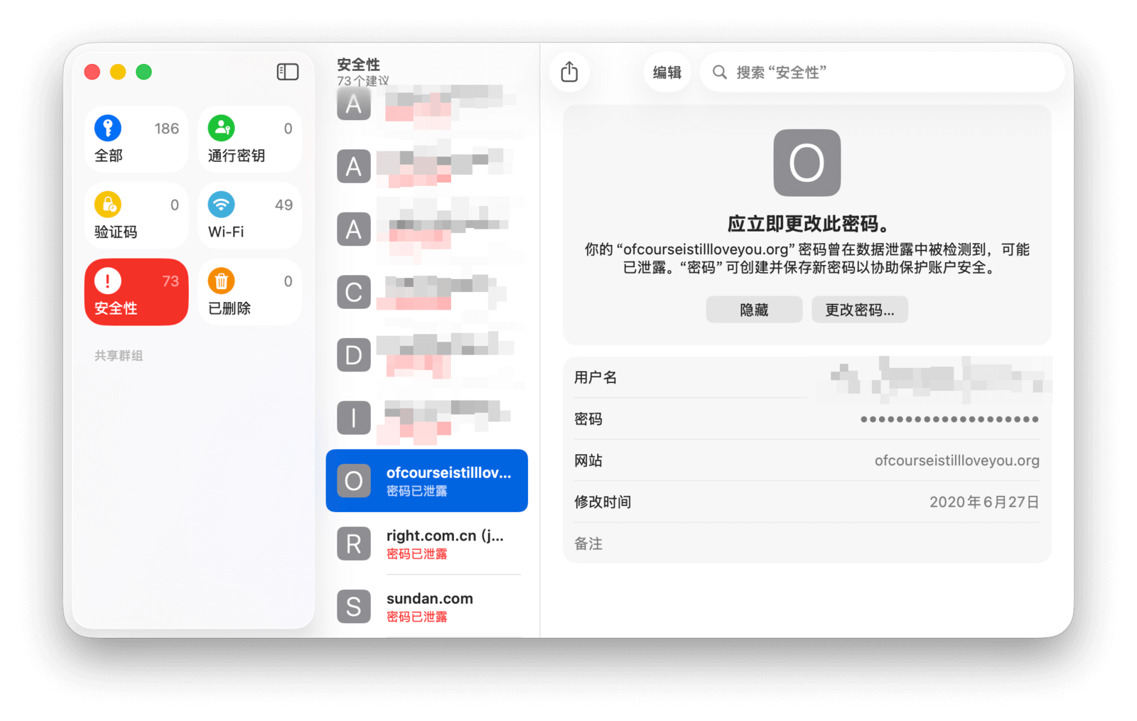 如果你在网站上更改了某个账户的密码,密码 app 会自动提示并帮助你更新其中保存的密码。你也可以手动修改账户信息:在密码 app 中选择你想要更改的账户,点击右侧详情页中的「编辑」按钮即可。若要删除一组账户密码,可以在选中它之后右键呼出菜单选择「删除」,也可以在编辑页面中点击「删除」按钮来完成。