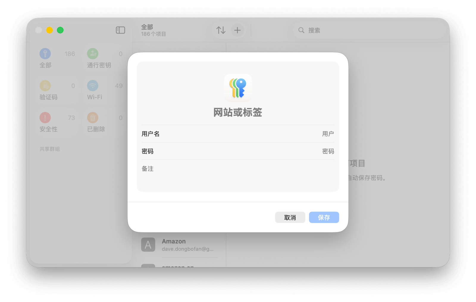 你可以在密码 app 中手动添加和管理密码。点击密码列表中右上角的「+」,输入用户名、密码和账户对应的网站即可。