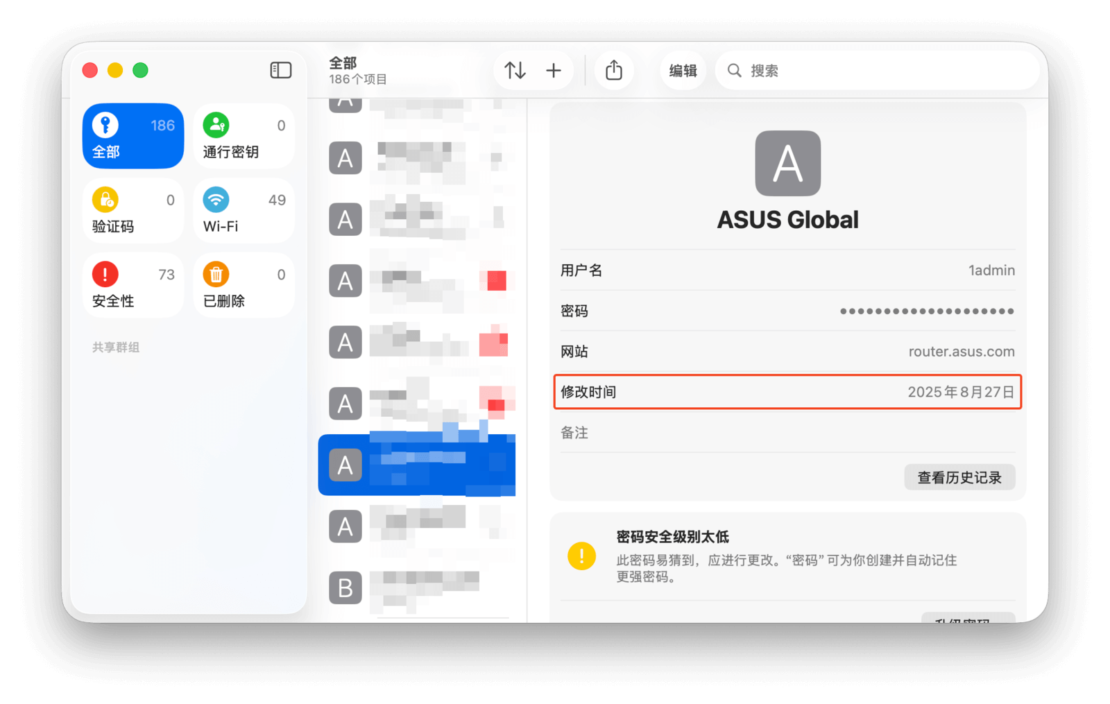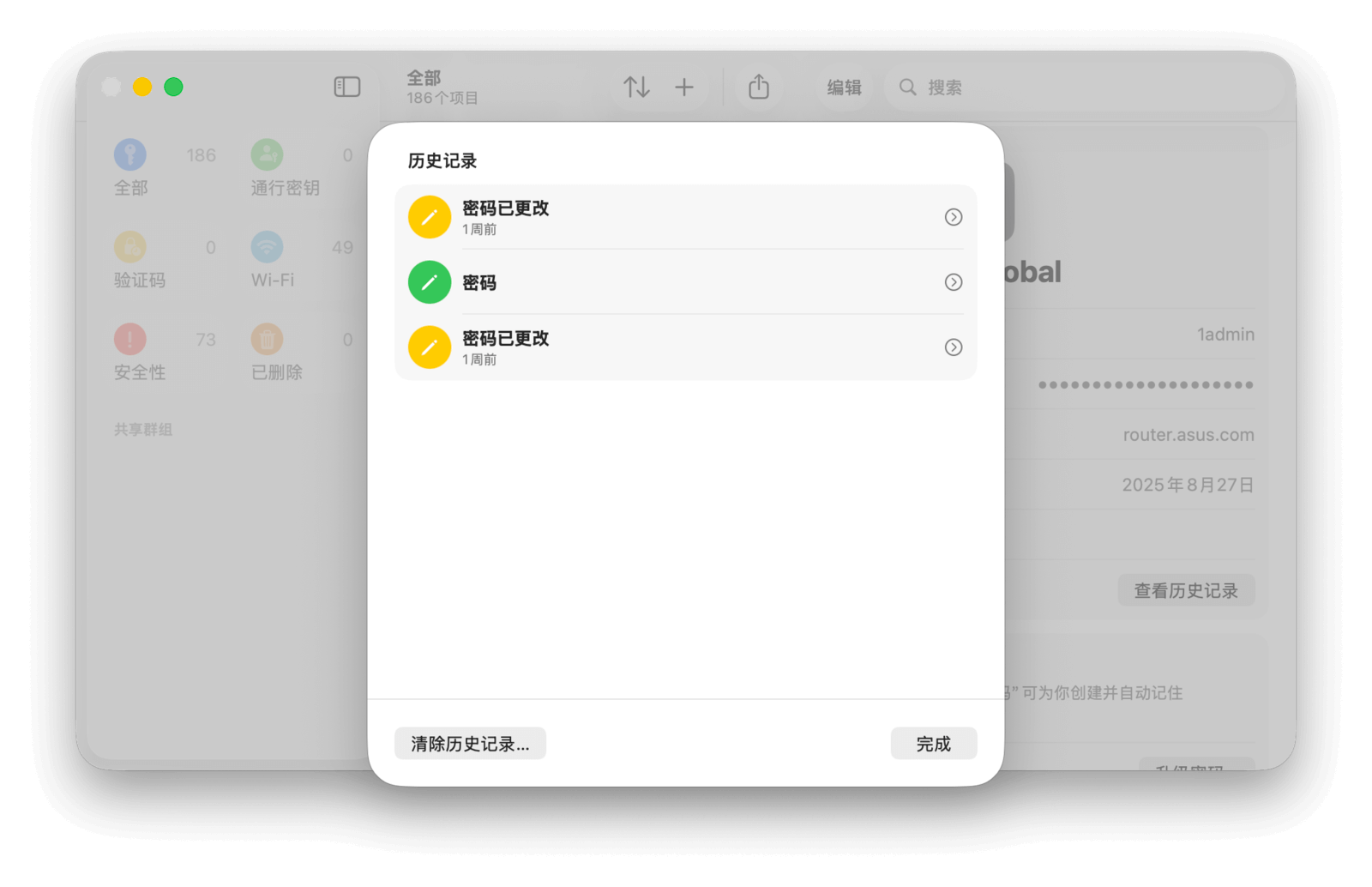 在 macOS Tahoe 版本中,苹果为密码 app 添加了修改时间和历史记录功能。当你手动编辑密码后,「修改时间」一栏会显示具体的修改日期;如果是当天修改的,则会显示「今天」。此外,你还可以点击「查看历史记录」按钮来追溯当前密码的所有修改记录,并查看每一次修改后的密码,方便随时调用。